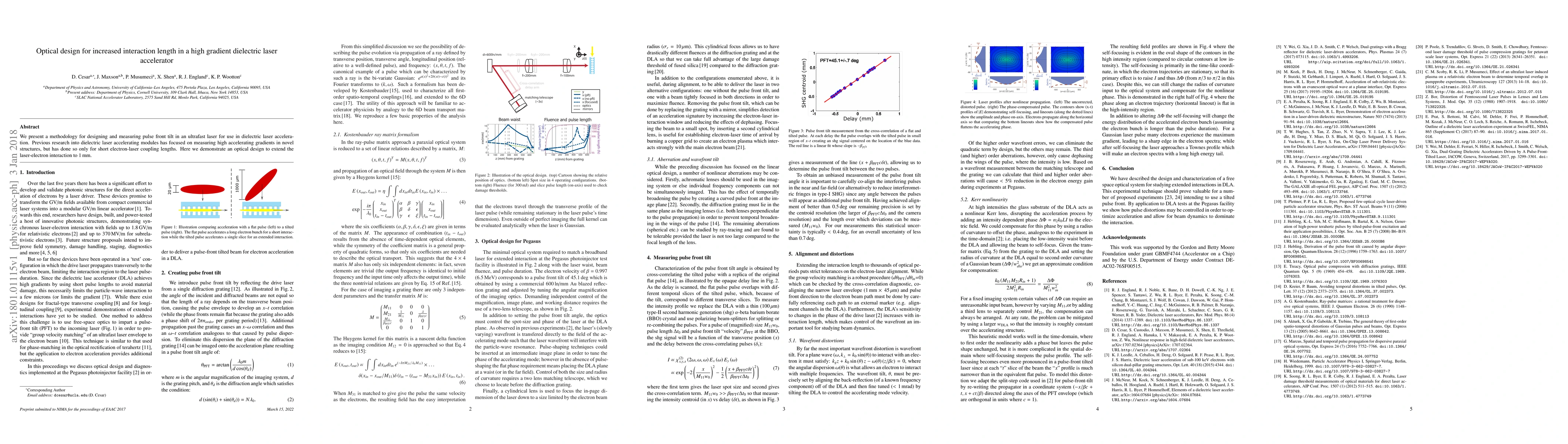 We present a methodology for designing and measuring pulse front tilt in an ultrafast laser for use in dielectric laser acceleration. Previous research into dielectric laser accelerating modules has focused on measuring high accelerating gradients in novel structures, but has done so only for short electron-laser coupling lengths. Here we demonstrate an optical design to extend the laser-electron interaction to 1mm.