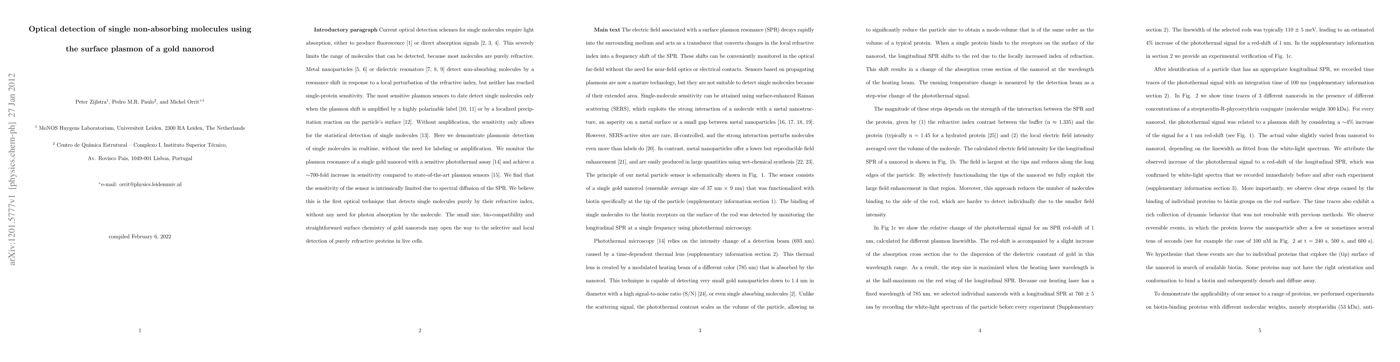 This paper demonstrates a novel optical detection method using the surface plasmon of a gold nanorod to detect single non-absorbing molecules based on their refractive index, without the need for labeling or amplification. The technique achieves a significant ~700-fold increase in sensitivity compared to existing plasmon sensors, potentially enabling the selective detection of refractive proteins in live cells.
