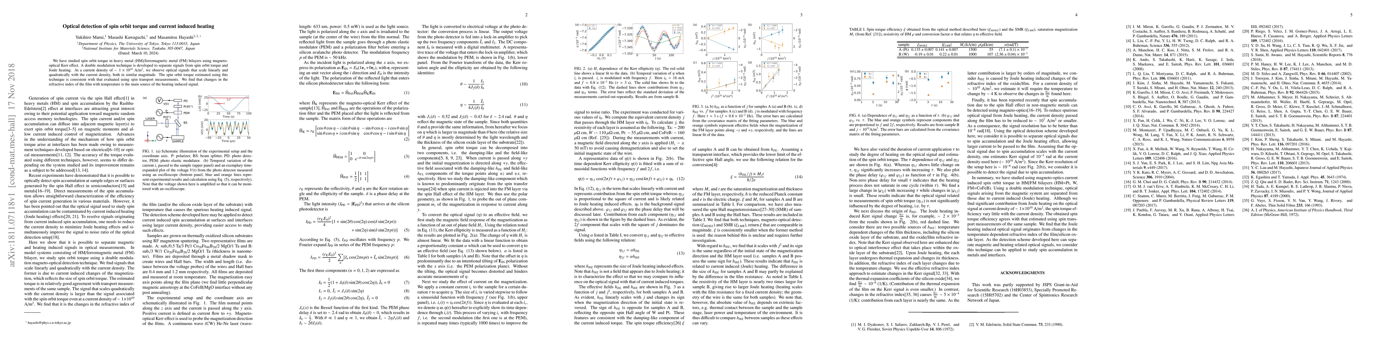 The study investigates spin orbit torque in HM/FM bilayers using magneto-optical Kerr effect, employing a double modulation technique to isolate spin orbit torque and current-induced heating signals. At high current densities, optical signals show linear and quadratic responses, consistent with spin transport measurements and attributing the heating-induced signal primarily to temperature-induced refractive index changes.