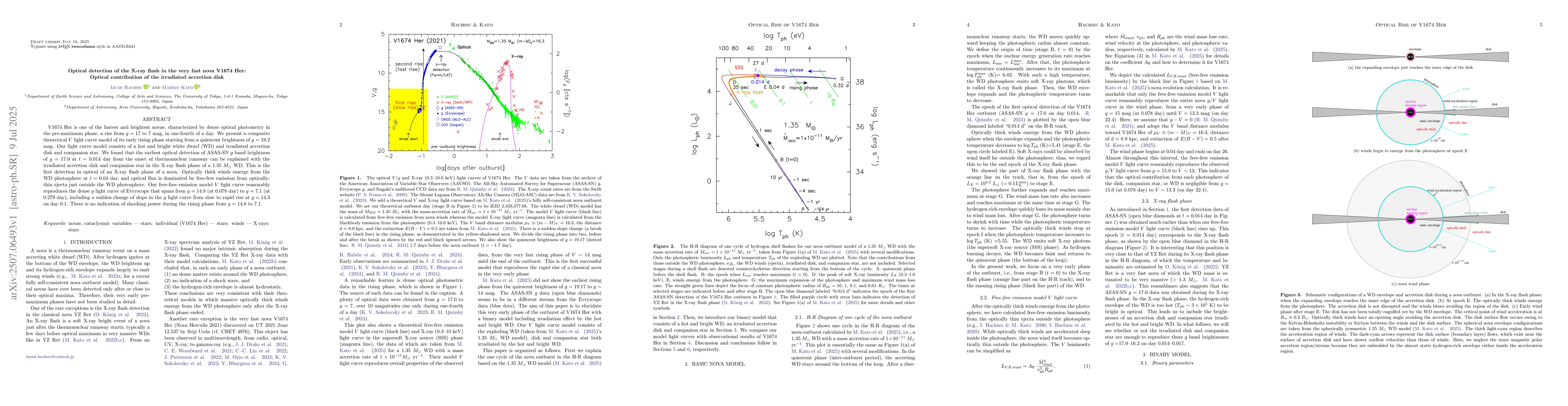 V1674 Her is one of the fastest and brightest novae, characterized by dense optical photometry in the pre-maximum phase, a rise from $g=17$ to 7 mag, in one-fourth of a day. We present a composite theoretical $V$ light curve model of its early rising phase starting from a quiescent brightness of $g=19.2$ mag. Our light curve model consists of a hot and bright white dwarf (WD) and irradiated accretion disk and companion star. We found that the earliest optical detection of ASAS-SN $g$ band brightness of $g=17.0$ at $t=0.014$ day from the onset of thermonuclear runaway can be explained with the irradiated accretion disk and companion star in the X-ray flash phase of a $1.35 ~M_\odot$ WD. This is the first detection in optical of an X-ray flash phase of a nova. Optically thick winds emerge from the WD photosphere at $t=0.04$ day, and optical flux is dominated by free-free emission from optically-thin ejecta just outside the WD photosphere. Our free-free emission model $V$ light curve reasonably reproduces the dense $g$ light curve of Evryscope that spans from $g=14.8$ (at 0.078 day) to $g=7.1$ (at 0.279 day), including a sudden change of slope in the $g$ light curve from slow to rapid rise at $g=14.3$ on day $0.1$. There is no indication of shocking power during the rising phase from $g=14.8$ to 7.1.