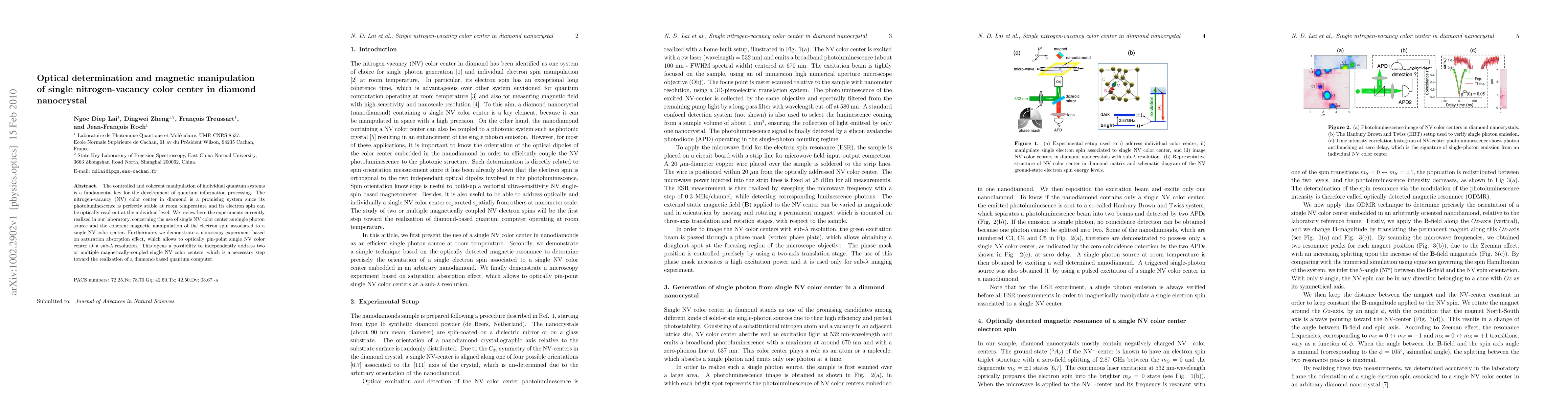 This paper reviews experiments on the optical determination and magnetic manipulation of single nitrogen-vacancy (NV) color centers in diamond nanocrystals, highlighting their potential as stable single photon sources and quantum information processing elements. The study also demonstrates a nanoscopy technique for pinpointing NV centers at sub-nanometer resolution, paving the way for addressing multiple NV centers for quantum computing.