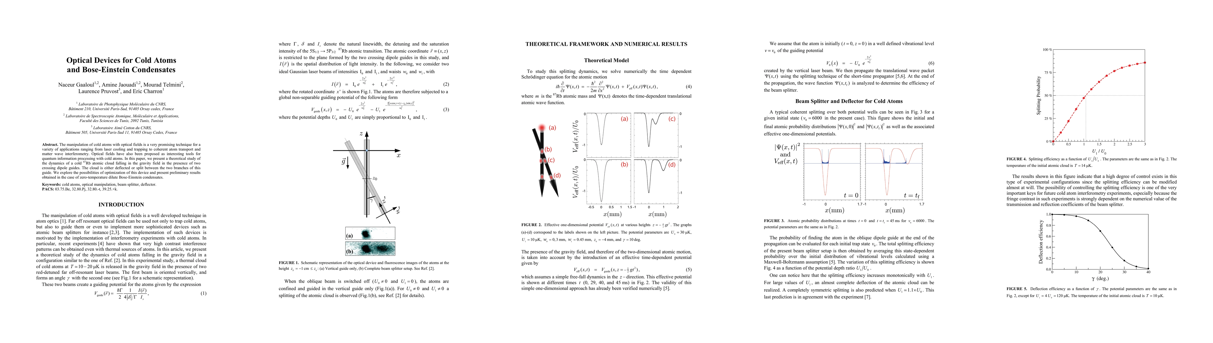 This paper investigates the dynamics of cold 87Rb atoms under optical fields, focusing on the deflection and splitting of atomic clouds using crossing dipole guides. It also explores optimization possibilities and presents preliminary results for zero-temperature Bose-Einstein condensates.