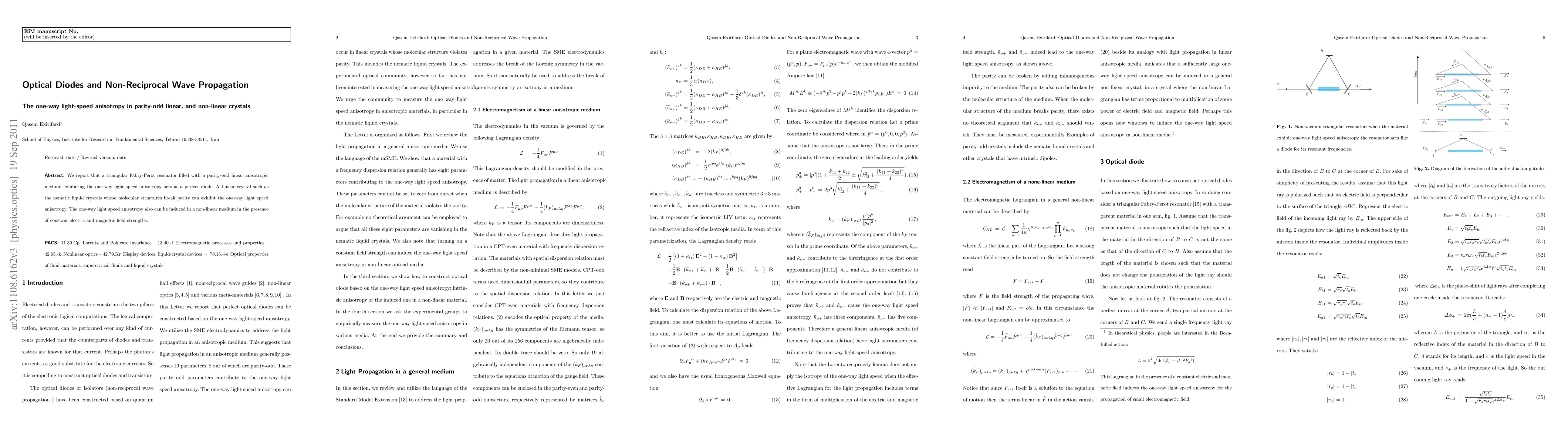 This paper demonstrates that a triangular Fabry-Perot resonator with a parity-odd linear anisotropic medium, such as nematic liquid crystals, can function as an optical diode due to one-way light-speed anisotropy. This effect can also be induced in non-linear media under constant electric and magnetic fields.