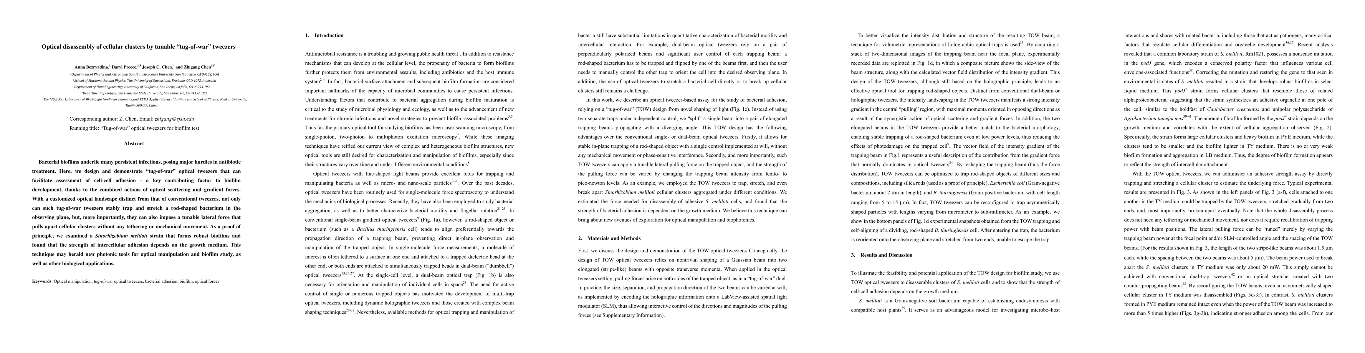 This paper introduces tunable tug-of-war optical tweezers for assessing bacterial cell-cell adhesion in biofilms, demonstrating their ability to stretch and disassemble bacterial clusters without mechanical movement. The technique shows potential for new photonic tools in biofilm research and broader biological applications.