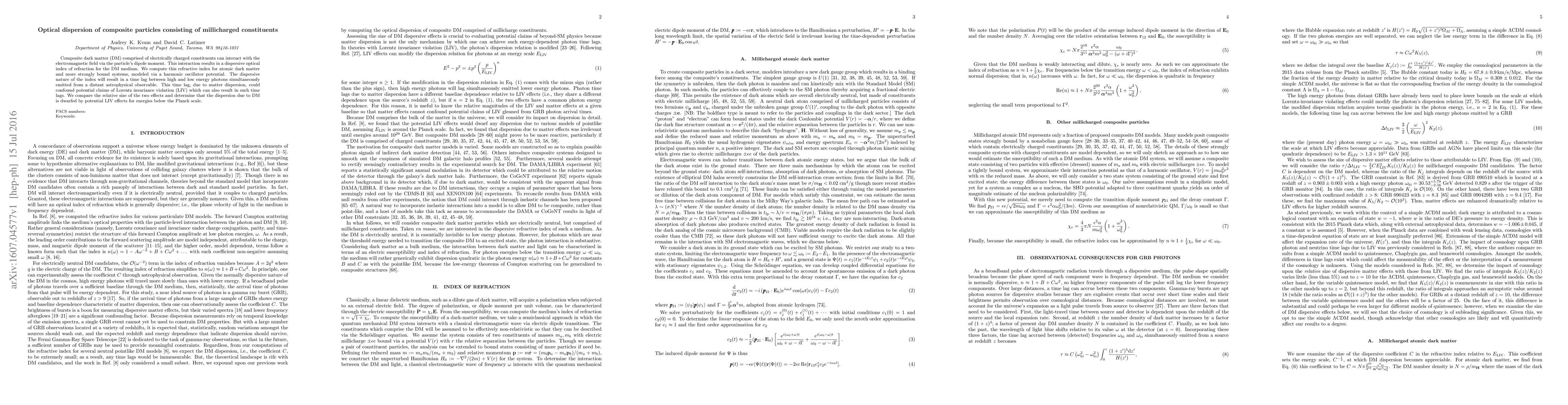 Composite dark matter (DM) comprised of electrically charged constituents can interact with the electromagnetic field via the particle's dipole moment. This interaction results in a dispersive optical index of refraction for the DM medium. We compute this refractive index for atomic dark matter and more strongly bound systems, modeled via a harmonic oscillator potential. The dispersive nature of the index will result in a time lag between high and low energy photons simultaneously emitted from a distant astrophysical observable. This time lag, due to matter dispersion, could confound potential claims of Lorentz invariance violation (LIV) which can also result in such time lags. We compare the relative size of the two effects and determine that the dispersion due to DM is dwarfed by potential LIV effects for energies below the Planck scale.
