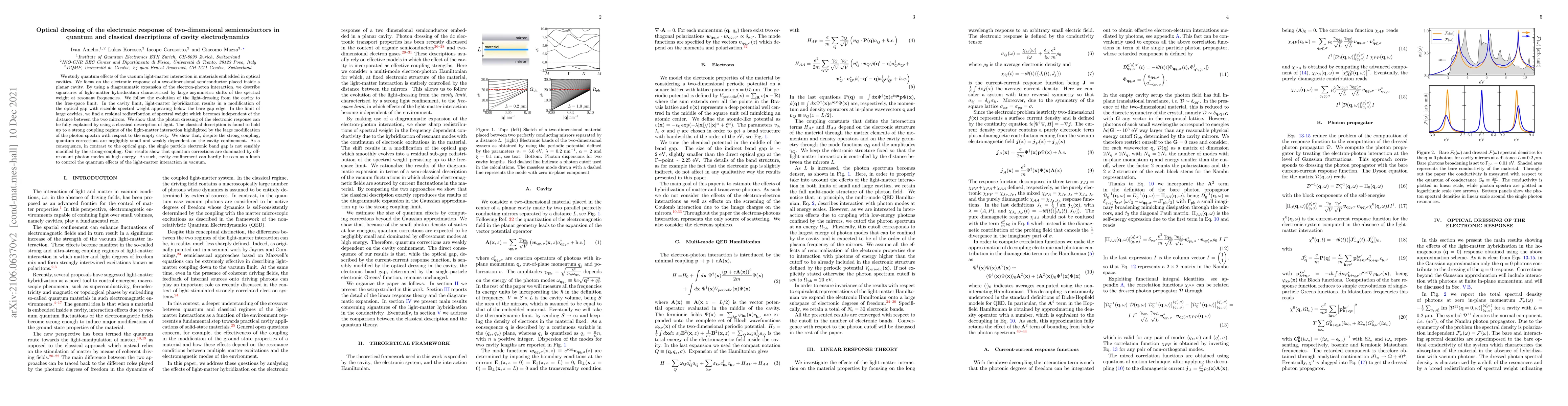 We study quantum effects of the vacuum light-matter interaction in materials embedded in optical cavities. We focus on the electronic response of a two-dimensional semiconductor placed inside a planar cavity. By using a diagrammatic expansion of the electron-photon interaction, we describe signatures of light-matter hybridization characterized by large asymmetric shifts of the spectral weight at resonant frequencies. We follow the evolution of the light-dressing from the cavity to the free-space limit. In the cavity limit, light-matter hybridization results in a modification of the optical gap with sizeable spectral weight appearing below the bare gap edge. In the limit of large cavities, we find a residual redistribution of spectral weight which becomes independent of the distance between the two mirrors. We show that the photon dressing of the electronic response can be fully explained by using a classical description of light. The classical description is found to hold up to a strong coupling regime of the light-matter interaction highlighted by the large modification of the photon spectra with respect to the empty cavity. We show that, despite the strong coupling, quantum corrections are negligibly small and weakly dependent on the cavity confinement. As a consequence, in contrast to the optical gap, the single particle electronic band gap is not sensibly modified by the strong-coupling. Our results show that quantum corrections are dominated by off-resonant photon modes at high energy. As such, cavity confinement can hardly be seen as a knob to control the quantum effects of the light-matter interaction in vacuum.