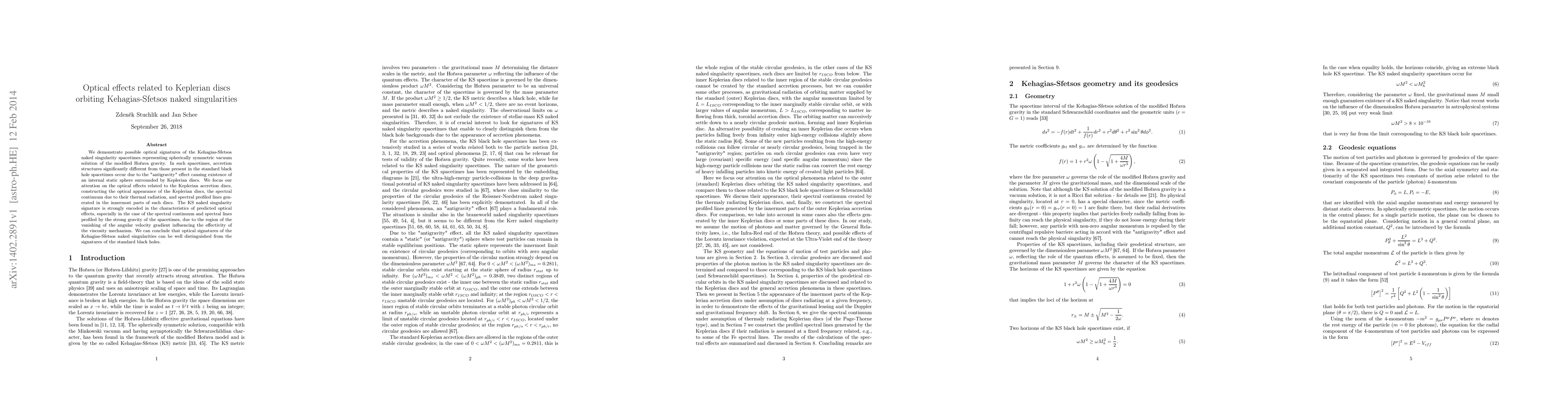 We demonstrate possible optical signatures of the Kehagias-Sfetsos naked singularity spacetimes representing spherically symmetric vacuum solution of the modified Ho\v{r}ava gravity. In such spacetimes, accretion structures significantly different from those present in the standard black hole spacetimes occur due to the "antigravity" effect causing existence of an internal static sphere surrounded by Keplerian discs. We focus our attention on the optical effects related to the Keplerian accretion discs, constructing the optical appearance of the Keplerian discs, the spectral continuum due to their thermal radiation, and spectral profiled lines generated in the innermost parts of such discs. The KS naked singularity signature is strongly encoded in the characteristics of predicted optical effects, especially in the case of the spectral continuum and spectral lines profiled by the strong gravity of the spacetimes, due to the region of the vanishing of the angular velocity gradient influencing the effectivity of the viscosity mechanism. We can conclude that optical signatures of the Kehagias-Sfetsos naked singularities can be well distinguished from the signatures of the standard black holes.