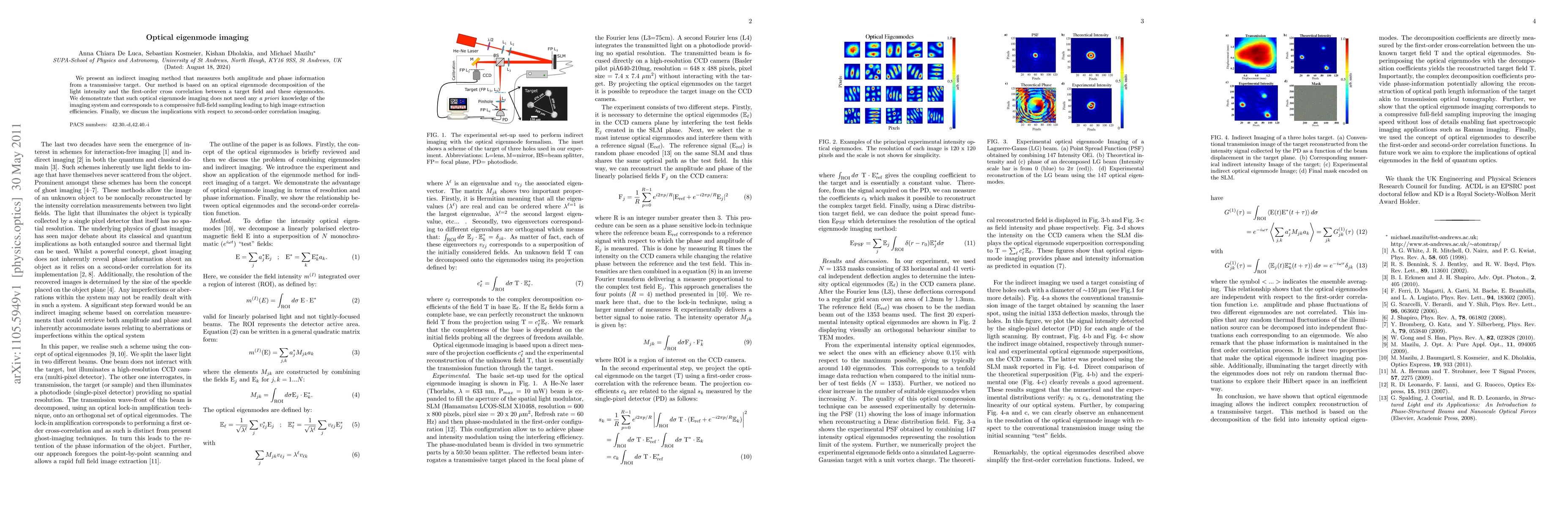 The paper introduces an optical eigenmode imaging method that measures both amplitude and phase information from a transmissive target without requiring prior knowledge of the imaging system, using a compressive full-field sampling approach.