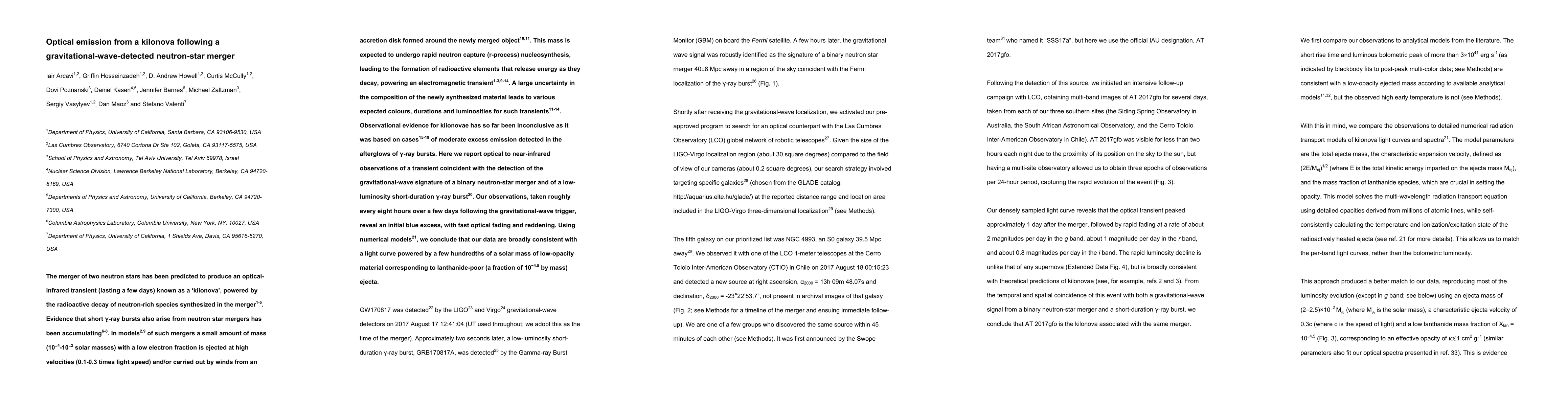 This paper reports optical to near-infrared observations of a kilonova following a neutron-star merger detected via gravitational waves and a short-duration gamma-ray burst. The observed transient shows initial blue excess, rapid optical fading, and reddening, consistent with light curves powered by low-opacity ejecta containing a small fraction of lanthanides.