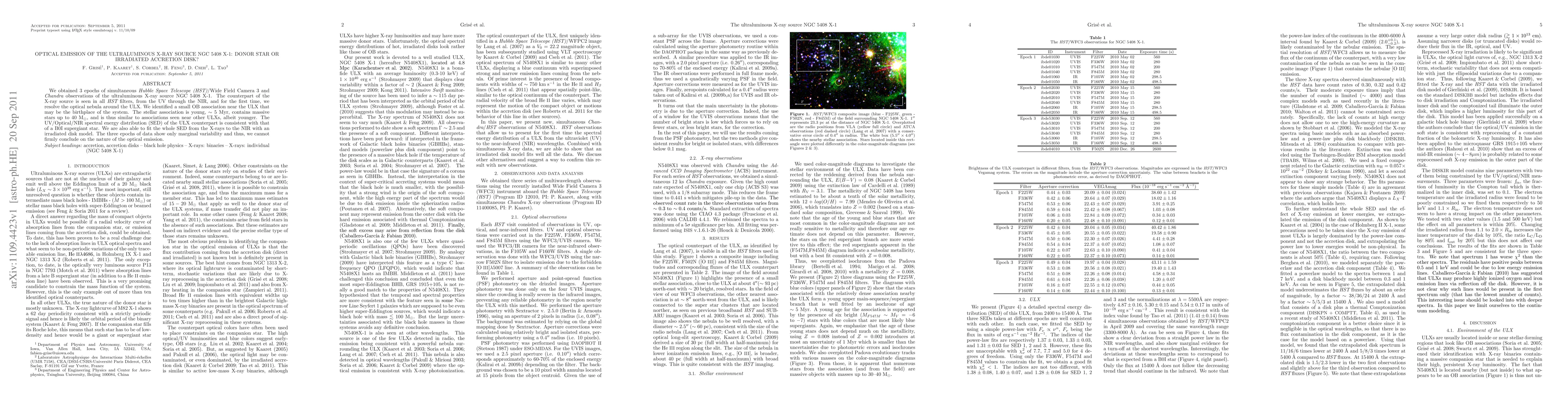 We obtained 3 epochs of simultaneous Hubble Space Telescope (HST)/Wide Field Camera 3 and Chandra observations of the ultraluminous X-ray source NGC 5408 X-1. The counterpart of the X-ray source is seen in all HST filters, from the UV through the NIR, and for the first time, we resolve the optical nebula around the ULX. We identified a small OB association near the ULX that may be the birthplace of the system. The stellar association is young, ~ 5 Myr, contains massive stars up to 40 solar masses, and is thus similar to associations seen near other ULXs, albeit younger. The UV/Optical/NIR spectral energy distribution (SED) of the ULX counterpart is consistent with that of a B0I supergiant star. We are also able to fit the whole SED from the X-rays to the NIR with an irradiated disk model. The three epochs of data show only marginal variability and thus, we cannot firmly conclude on the nature of the optical emission.