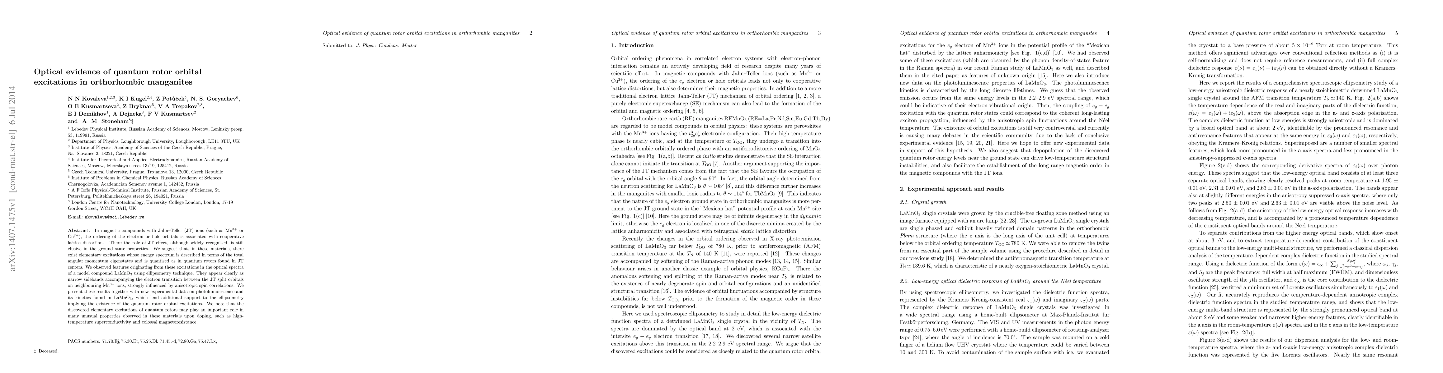 In magnetic compounds with Jahn-Teller (JT) ions (such as Mn3+ or Cu2+), the ordering of the electron or hole orbitals is associated with cooperative lattice distortions. There the role of JT effect, although widely recognised, is still elusive in the ground state properties. We suggest that, in these materials, there exist elementary excitations whose energy spectrum is described in terms of the total angular momentum eigenstates and is quantised as in quantum rotors found in JT centers. We observed features originating from these excitations in the optical spectra of a model compound LaMnO3 using ellipsometry technique. They appear clearly as narrow sidebands accompanying the electron transition between the JT split orbitals on neighbouring Mn3+ ions, strongly influenced by anisotropic spin correlations. We present these results together with new experimental data on photoluminescence and its kinetics found in LaMnO3, which lend additional support to the ellipsometry implying the existence of the quantum rotor orbital excitations. We note that the discovered elementary excitations of quantum rotors may play an important role in many unusual properties observed in these materials upon doping, such as high-temperature superconductivity and colossal magnetoresistance.