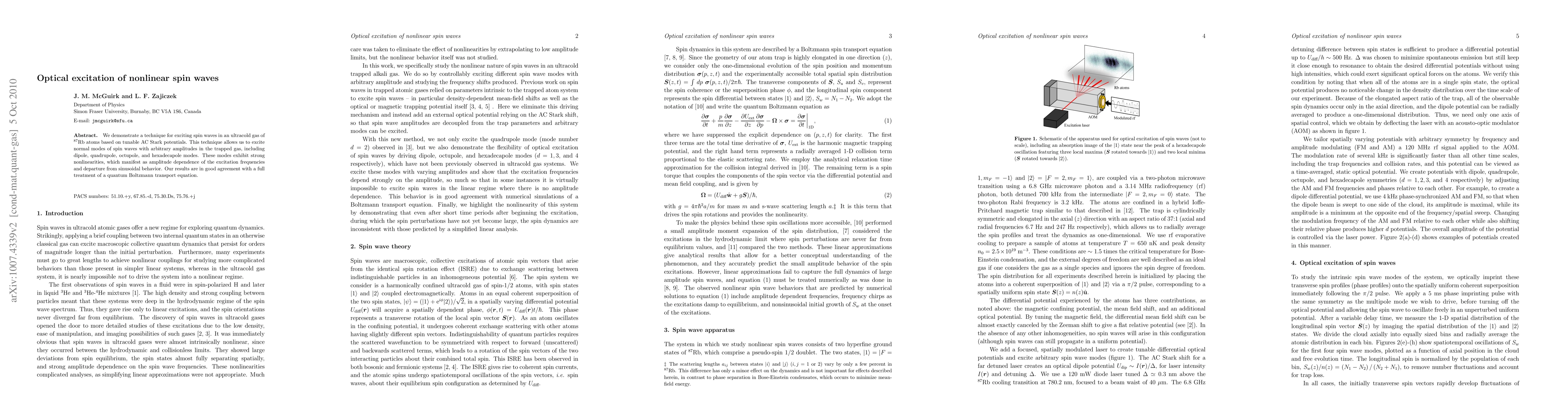 This paper presents a method to excite various nonlinear spin wave modes in an ultracold gas of Rb-87 atoms using tunable AC Stark potentials, revealing strong nonlinearities and validating these findings with a quantum Boltzmann transport equation.