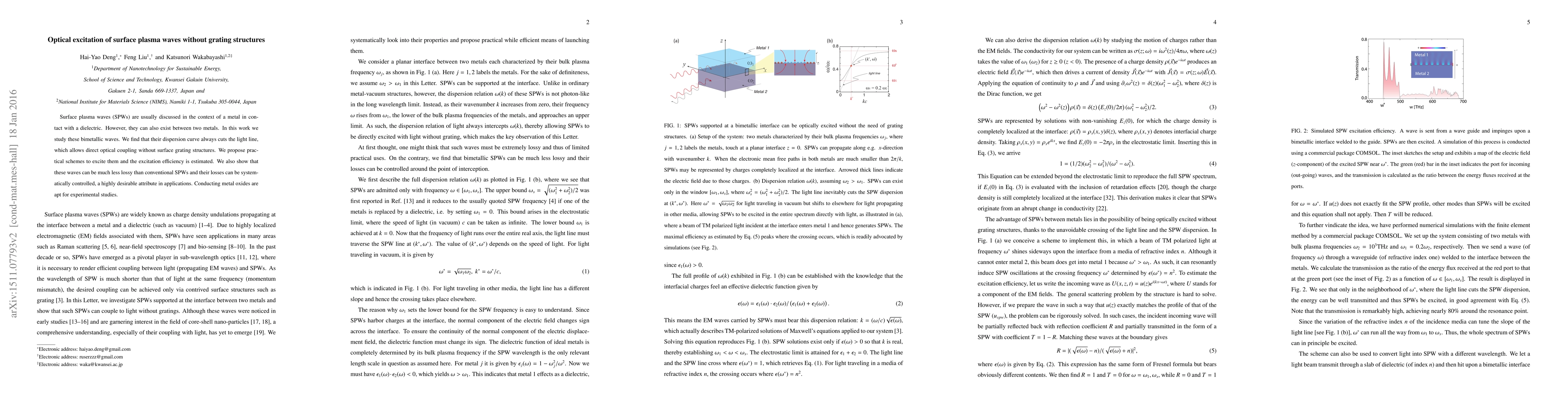 This paper investigates bimetallic surface plasma waves (SPWs) that can be directly optically excited without grating structures, as their dispersion curve intersects the light line. The study proposes practical excitation schemes and demonstrates that these waves are less lossy than conventional SPWs, making them suitable for applications.