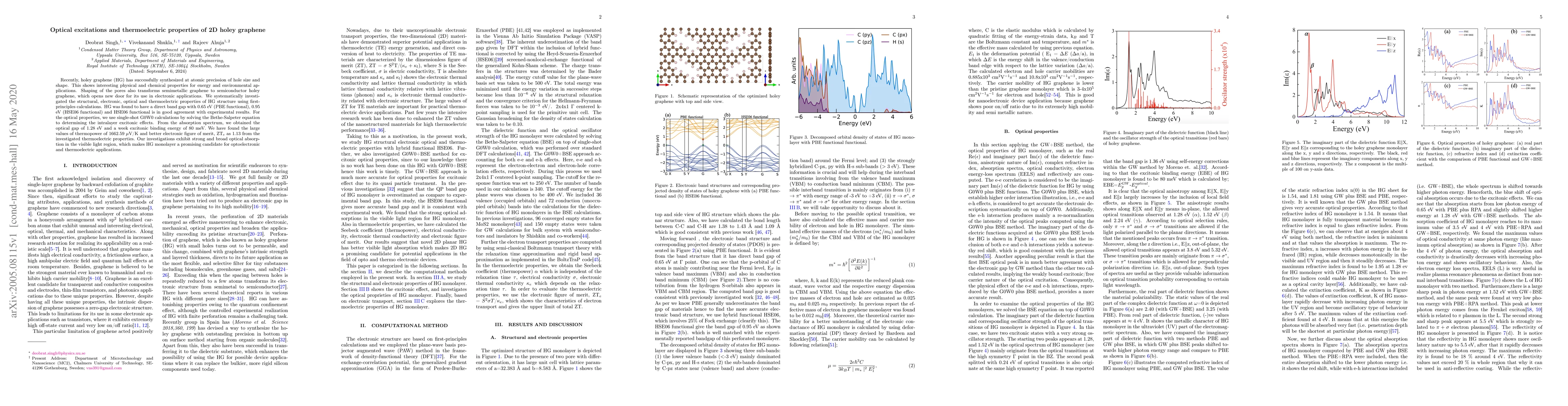 Holey graphene exhibits a direct band gap, strong optical absorption in visible light, and high thermopower, making it a promising candidate for optoelectronic and thermoelectric applications.