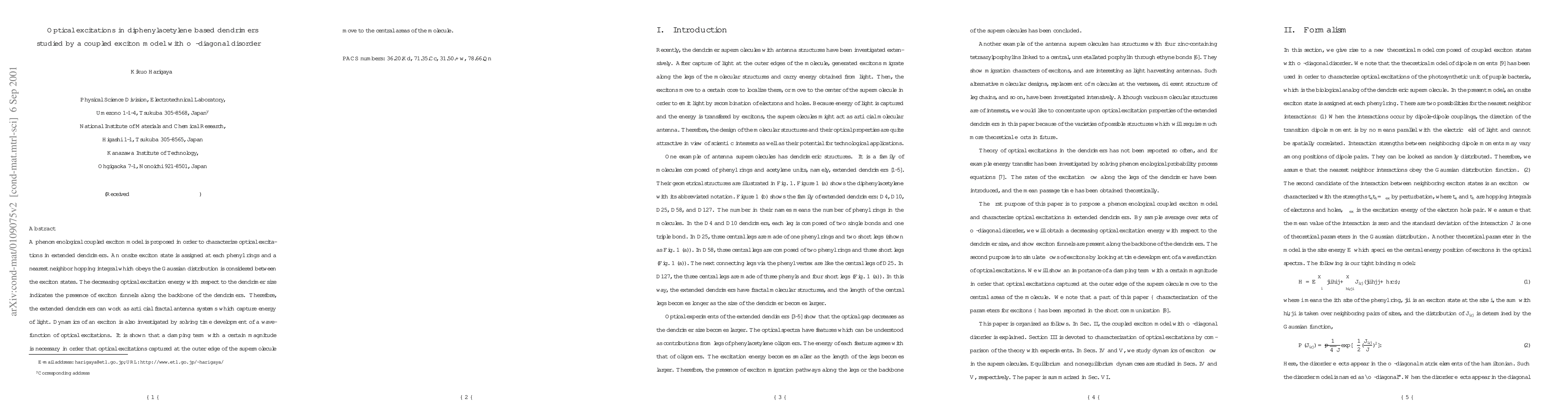 A phenomenological coupled exciton model is proposed in order to characterize optical excitations in extended dendrimers. An onsite exciton state is assigned at each phenyl rings and a nearest neighbor hopping integral which obeys the Gaussian distribution is considered between the exciton states. The decreasing optical excitation energy with respect to the dendrimer size indicates the presence of exciton funnels along the backbone of the dendrimers. Therefore, the extended dendrimers can work as artificial fractal antenna systems which capture energy of light. Dynamics of an exciton is also investigated by solving time development of a wavefunction of optical excitations. It is shown that a damping term with a certain magnitude is necessary in order that optical excitations captured at the outer edge of the supermolecule move to the central areas of the molecule.