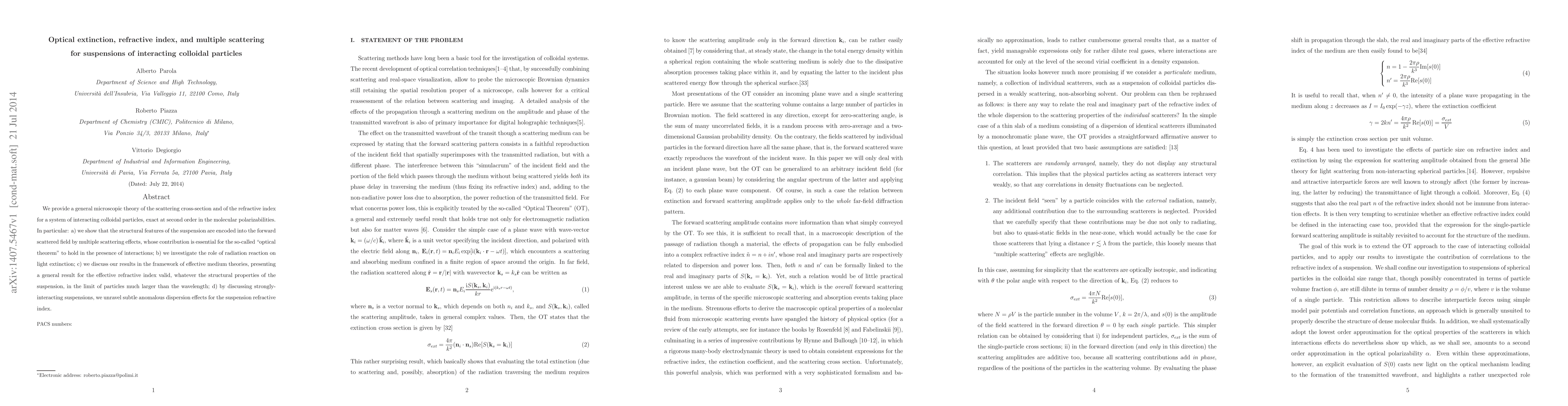 We provide a general microscopic theory of the scattering cross-section and of the refractive index for a system of interacting colloidal particles, exact at second order in the molecular polarizabilities. In particular: a) we show that the structural features of the suspension are encoded into the forward scattered field by multiple scattering effects, whose contribution is essential for the so-called "optical theorem" to hold in the presence of interactions; b) we investigate the role of radiation reaction on light extinction; c) we discuss our results in the framework of effective medium theories, presenting a general result for the effective refractive index valid, whatever the structural properties of the suspension, in the limit of particles much larger than the wavelength; d) by discussing strongly-interacting suspensions, we unravel subtle anomalous dispersion effects for the suspension refractive index.