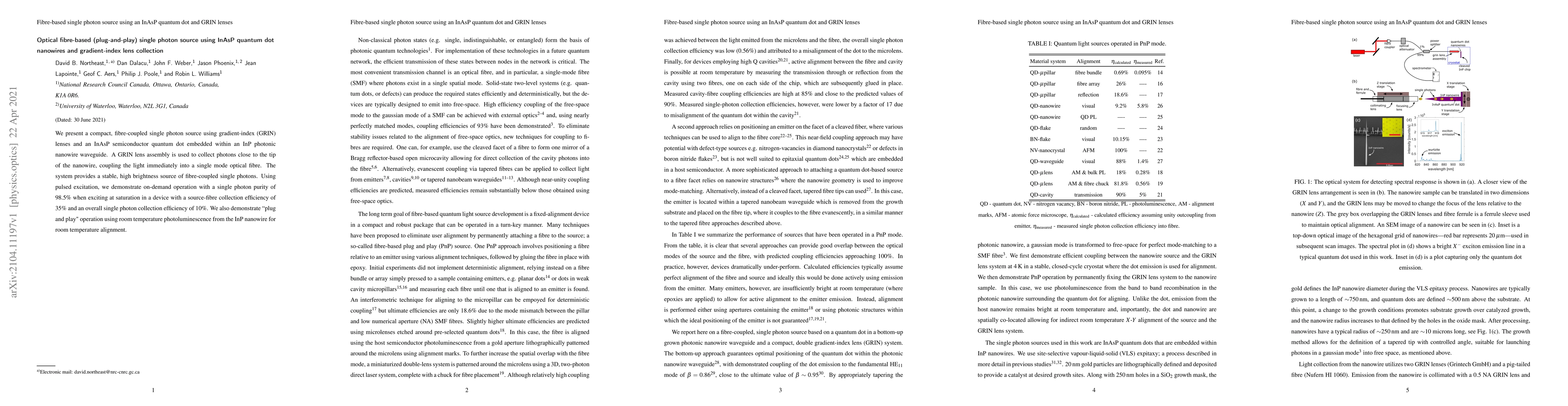 This paper describes a compact optical fibre-based single photon source utilizing InAsP quantum dots in InP nanowires and gradient-index lenses. The system achieves high brightness and 98.5% single photon purity, demonstrating "plug and play" functionality for easy room temperature alignment.