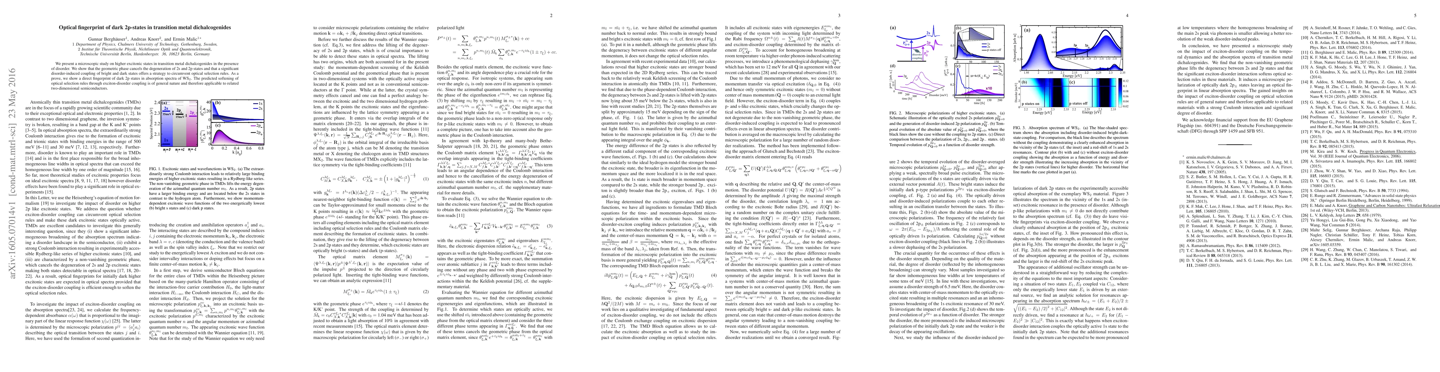 We present a microscopic study on higher excitonic states in transition metal dichalcogenides in the presence of disorder. We show that the geometric phase cancels the degeneration of 2s and 2p states and that a significant disorder-induced coupling of bright and dark states offers a strategy to circumvent optical selection rules. As a prove, we show a direct fingerprint of dark 2p states in absorption spectra of WS$_2$. The predicted softening of optical selection rules through exciton-disorder coupling is of general nature and therefore applicable to related two-dimensional semiconductors.