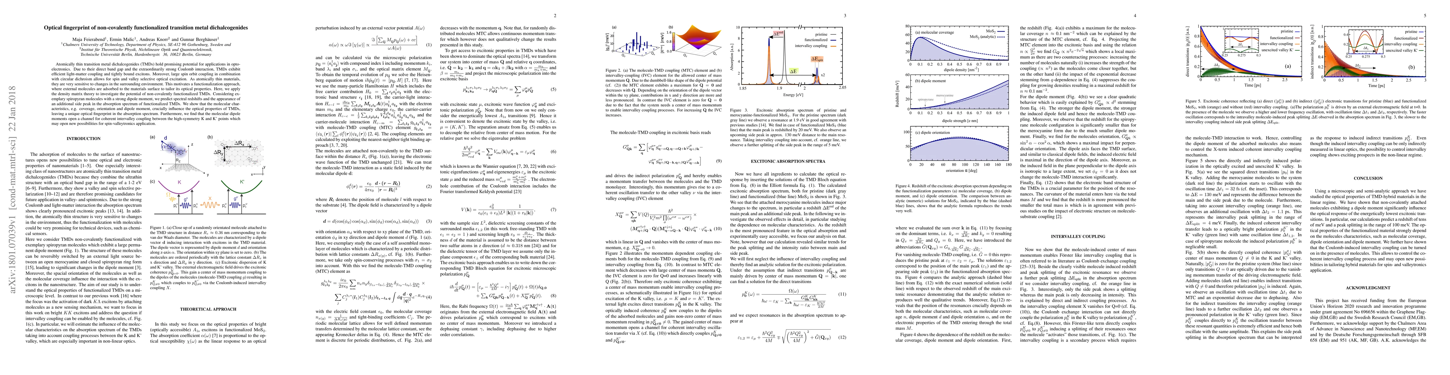 Atomically thin transition metal dichalcogenides (TMDs) hold promising potential for applications in optoelectronics. Due to their direct band gap and the extraordinarily strong Coulomb interaction, TMDs exhibit efficient light-matter coupling and tightly bound excitons. Moreover, large spin orbit coupling in combination with circular dichroism allows for spin and valley selective optical excitation. As atomically thin materials, they are very sensitive to changes in the surrounding environment. This motivates a functionalization approach, where external molecules are adsorbed to the materials surface to tailor its optical properties. Here, we apply the density matrix theory to investigate the potential of non-covalently functionalized TMDs. Considering exemplary spiropyran molecules with a strong dipole moment, we predict spectral redshifts and the appearance of an additional side peak in the absorption spectrum of functionalized TMDs. We show that the molecular characteristics, e.g. coverage, orientation and dipole moment, crucially influence the optical properties of TMDs, leaving a unique optical fingerprint in the absorption spectrum. Furthermore, we find that the molecular dipole moments open a channel for coherent intervalley coupling between the high-symmetry K and K' points which may open new possibilities for spin-valleytronics application.