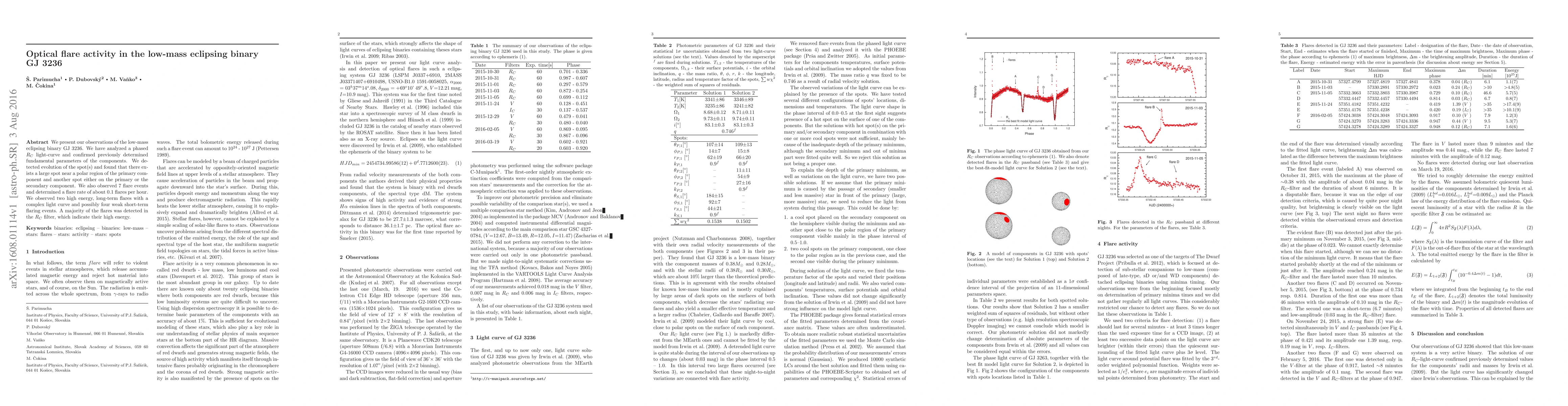 We present our observations of the low-mass eclipsing binary GJ~3236. We have analyzed a phased $R_C$ light-curve and confirmed previously determined fundamental parameters of the components. We detected evolution of the spot(s) and found that there exists a large spot near a polar region of the primary component and another spot either on the primary or the secondary component. We also observed 7 flare events and determined a flare rate of about 0.1 flares per hour. We observed two high energy, long-term flares with a complex light curve and possibly four weak short-term flaring events. A majority of the flares was detected in the $R_C$ filter, which indicate their high energy.