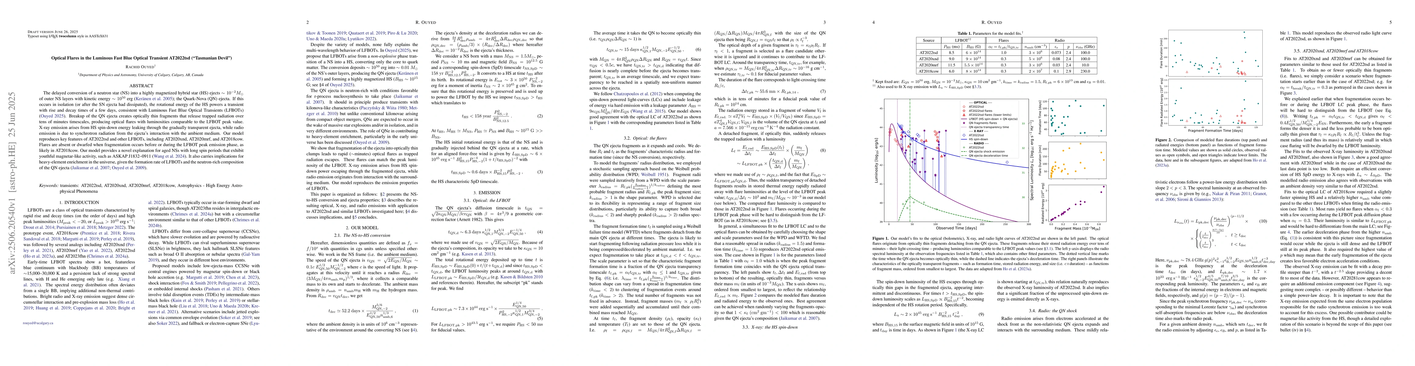 The delayed conversion of a neutron star (NS) into a highly magnetized hybrid star (HS) ejects ~ 0.01Msun of outer NS layers with kinetic energy ~ 10^50 erg (Keranen et al. 2005); the Quark-Nova (QN) ejecta. If this occurs in isolation (or after the SN ejecta had dissipated), the rotational energy of the HS powers a transient with rise and decay times of a few days, consistent with Luminous Fast Blue Optical Transients (LFBOTs) (Ouyed 2025). Breakup of the QN ejecta creates optically thin fragments that release trapped radiation over tens of minutes timescales, producing optical flares with luminosities comparable to the LFBOT peak value. X-ray emission arises from HS spin-down energy leaking through the gradually transparent ejecta, while radio emission is due to synchrotron radiation from the ejecta's interaction with the ambient medium. Our model reproduces key features of AT2022tsd and other LFBOTs, including AT2020xnd, AT2020mrf, and AT2018cow. Flares are absent or dwarfed when fragmentation occurs before or during the LFBOT peak emission phase, as likely in AT2018cow. Our model provides a novel explanation for aged NSs with long spin periods that exhibit youthful magnetar-like activity, such as ASKAP J1832-0911 (Wang et al. 2024). It also carries implications for heavy-element enrichment in the universe, given the formation rate of LFBOTs and the neutron-rich composition of the QN ejecta (Jaikumar et al. 2007, Ouyed et al. 2009).