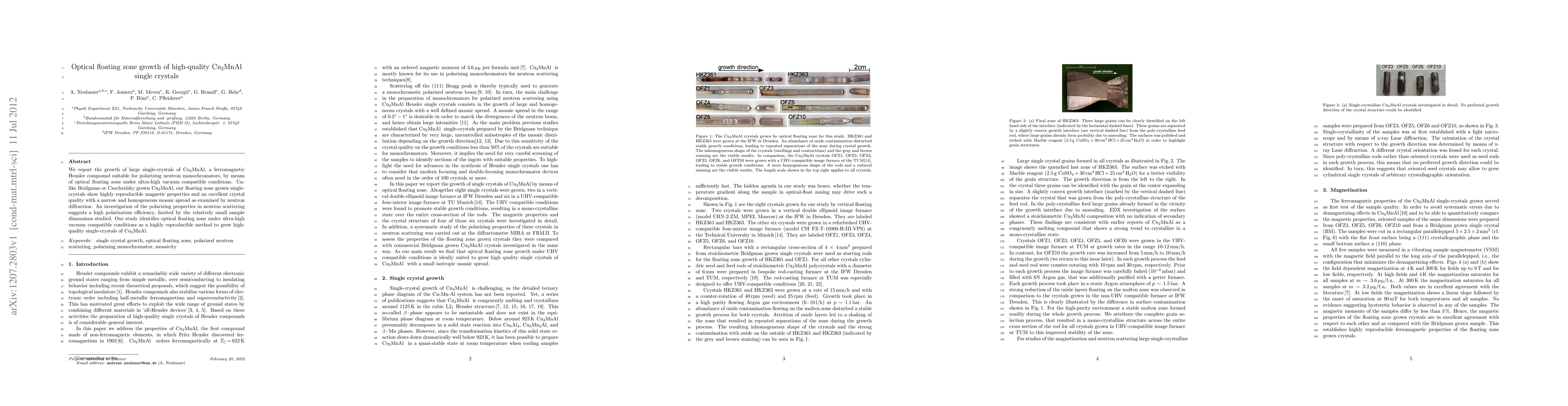 This paper details the successful growth of high-quality Cu2MnAl single crystals using optical floating zone method under ultra-high vacuum, demonstrating superior magnetic properties and crystal quality compared to other methods. The study highlights the method's reproducibility and high polarization efficiency for neutron scattering applications.