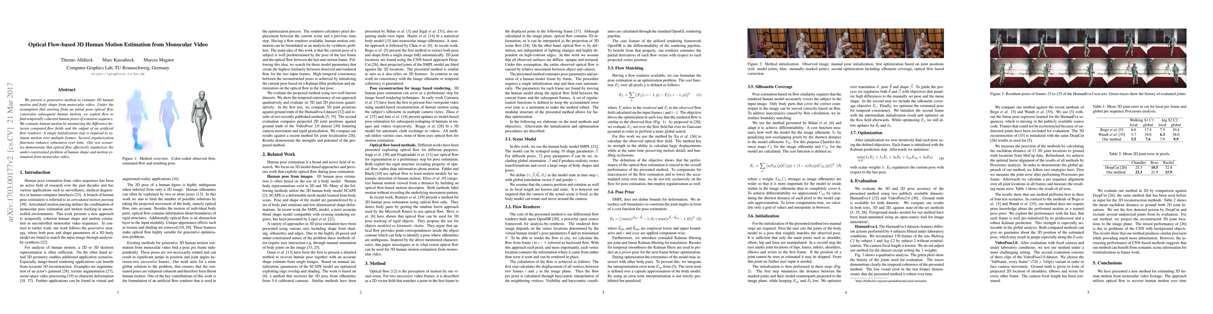 This paper proposes a generative method to estimate 3D human motion and body shape from monocular video using optical flow. It leverages initial pose and optical flow to find temporally coherent human poses, minimizing the difference between computed and rendered flow fields to enhance robustness.