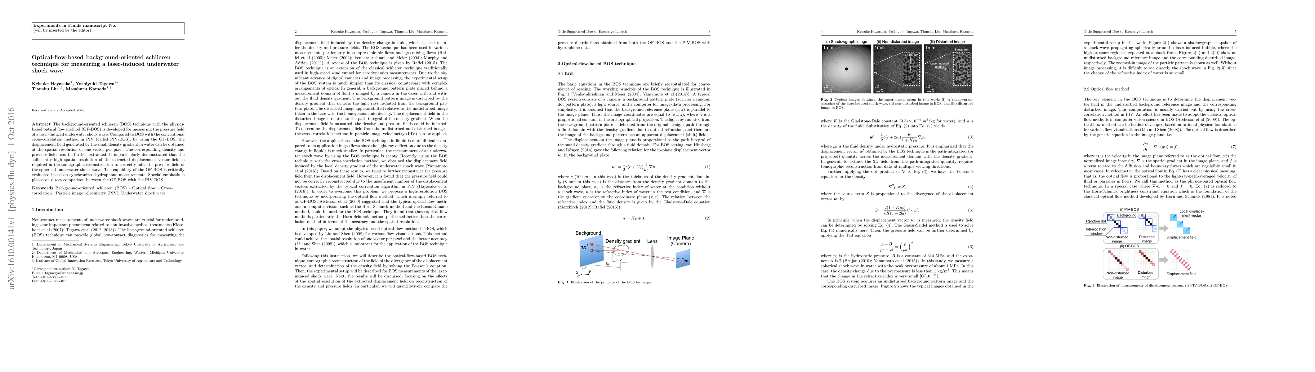 The background-oriented schlieren (BOS) technique with the physics-based optical flow method (OF-BOS) is developed for measuring the pressure field of a laser-induced underwater shock wave. Compared to BOS with the conventional cross-correlation method in PIV (called PIV-BOS), by using the OF-BOS, the displacement field generated by the small density gradient in water can be obtained at the spatial resolution of one vector per pixel. The corresponding density and pressure fields can be further extracted. It is particularly demonstrated that the sufficiently high spatial resolution of the extracted displacement vector field is required in the tomographic reconstruction to correctly infer the pressure field of the spherical underwater shock wave. The capability of the OF-BOS is critically evaluated based on synchronized hydrophone measurements. Special emphasis is placed on direct comparison between the OF-BOS with the PIV-BOS.