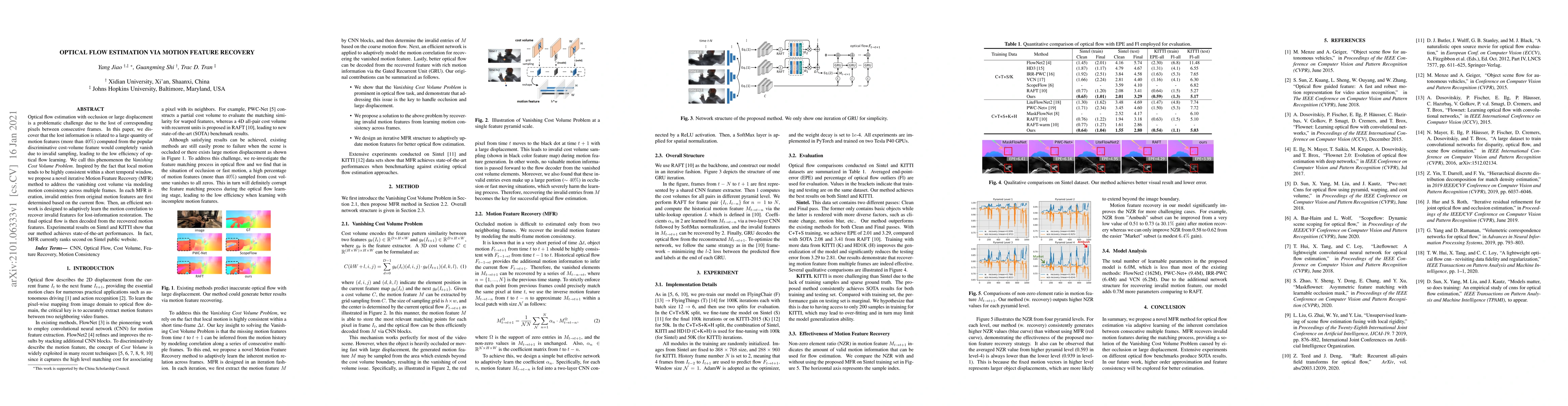 This research introduces the 'Vanishing Cost Volume Problem' in optical flow estimation, where over 40% of motion features are lost due to invalid sampling. A solution, Motion Feature Recovery (MFR), is proposed to address this issue by iteratively learning and restoring these lost features, achieving state-of-the-art performance on Sintel and KITTI datasets.