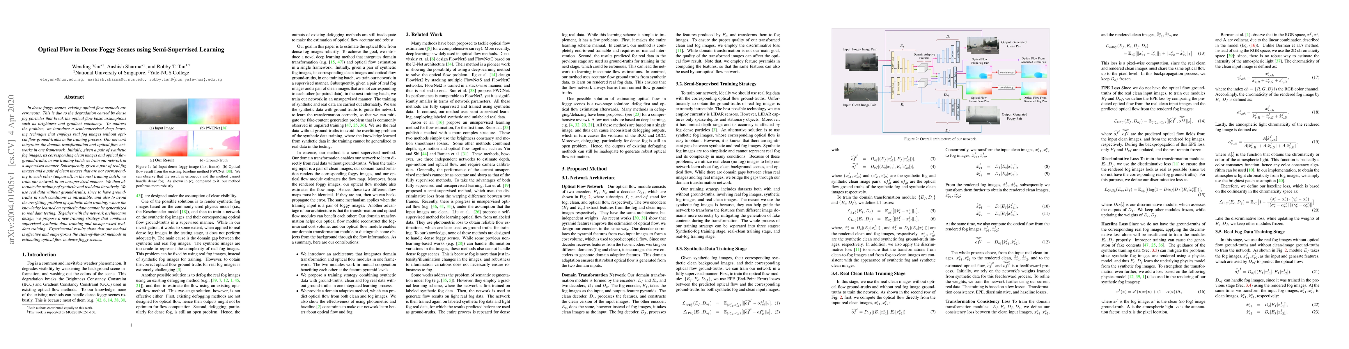 This paper proposes a semi-supervised deep learning technique to estimate optical flow in dense foggy scenes, combining supervised training with synthetic data and unsupervised training with real foggy images. The method outperforms existing techniques, addressing the challenges posed by dense fog.