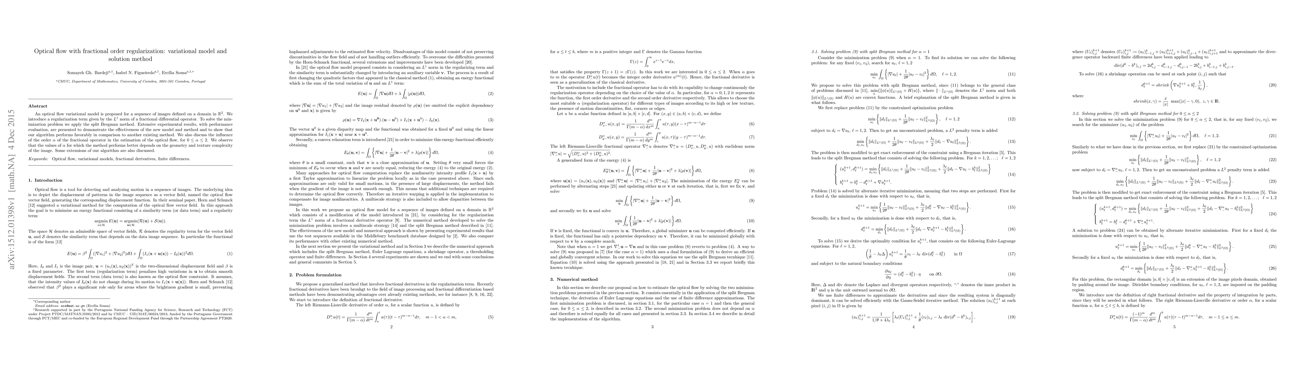 An optical flow variational model is proposed for a sequence of images defined on a domain in $\mathbb{R}^2$. We introduce a regularization term given by the $L^1$ norm of a fractional differential operator. To solve the minimization problem we apply the split Bregman method. Extensive experimental results, with performance evaluation, are presented to demonstrate the effectiveness of the new model and method and to show that our algorithm performs favorably in comparison to another existing method. We also discuss the influence of the order $\alpha$ of the fractional operator in the estimation of the optical flow, for $0 \leq \alpha \leq 2$. We observe that the values of $\alpha$ for which the method performs better depends on the geometry and texture complexity of the image. Some extensions of our algorithm are also discussed.