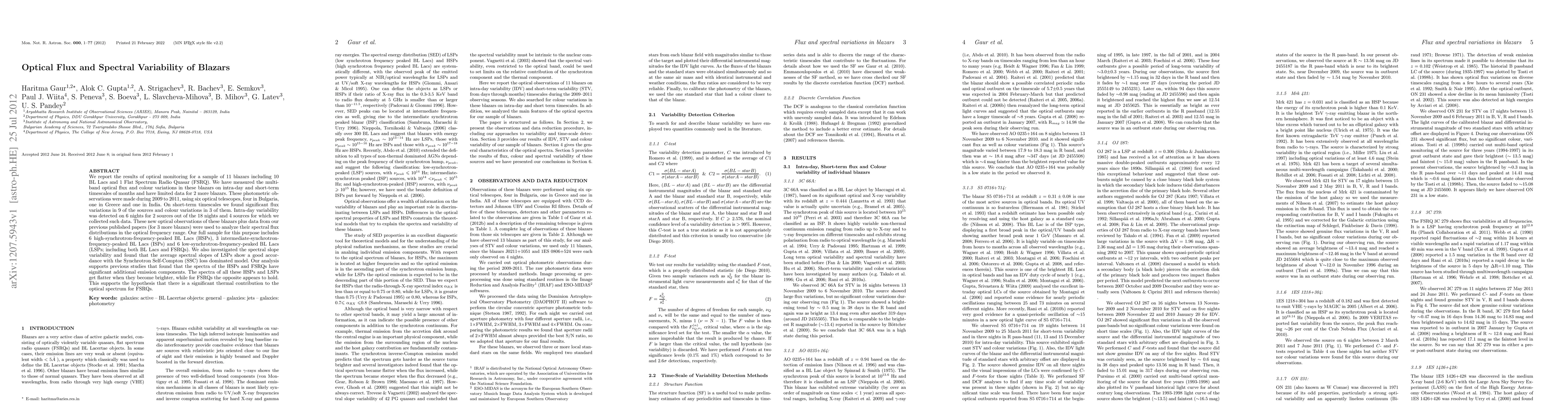 This study reports optical monitoring of 11 blazars, revealing significant flux and color variations on short-term timescales, with intra-day variability detected in some sources. The analysis of spectral flux distributions supports the Synchrotron Self-Compton model for low-synchrotron-frequency-peaked BL Lacs and indicates a thermal contribution to Flat Spectrum Radio Quasars' optical spectra.