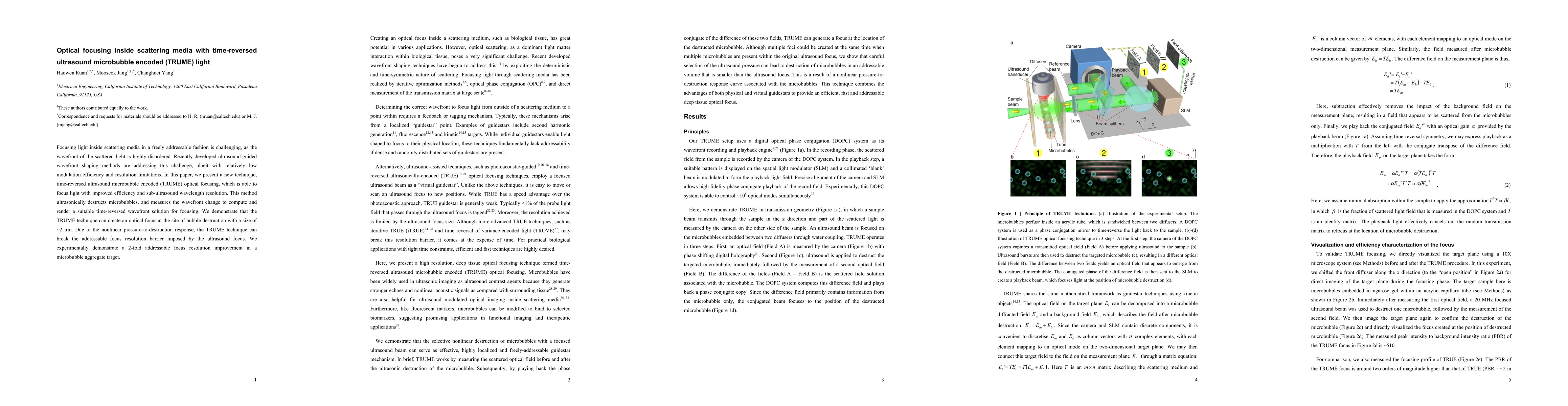 The paper introduces TRUME, a novel technique for focusing light in scattering media using ultrasound-encoded microbubbles, achieving improved efficiency and resolution by ultrasonically destructing microbubbles to measure wavefront changes and compute time-reversed wavefront solutions, demonstrating a 2-fold resolution improvement.