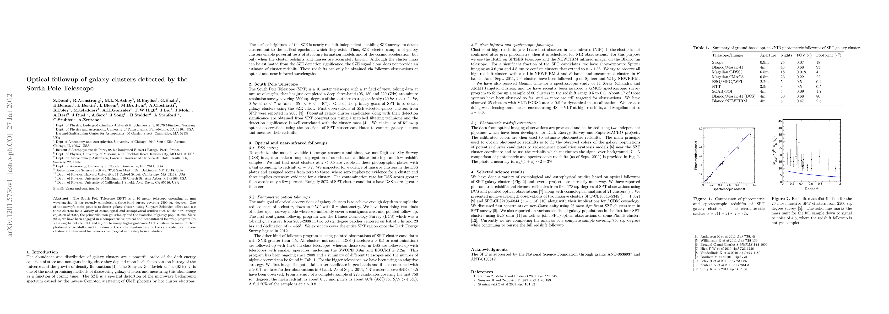 The South Pole Telescope (SPT) is a 10 meter telescope operating at mm wavelengths. It has recently completed a three-band survey covering 2500 sq. degrees. One of the survey's main goals is to detect galaxy clusters using Sunyaev-Zeldovich effect and use these clusters for a variety of cosmological and astrophysical studies such as the dark energy equation of state, the primordial non-gaussianity and the evolution of galaxy populations. Since 2005, we have been engaged in a comprehensive optical and near-infrared followup program (at wavelengths between 0.4 and 5 {\mu}m) to image high-significance SPT clusters, to measure their photometric redshifts, and to estimate the contamination rate of the candidate lists. These clusters are then used for various cosmological and astrophysical studies.