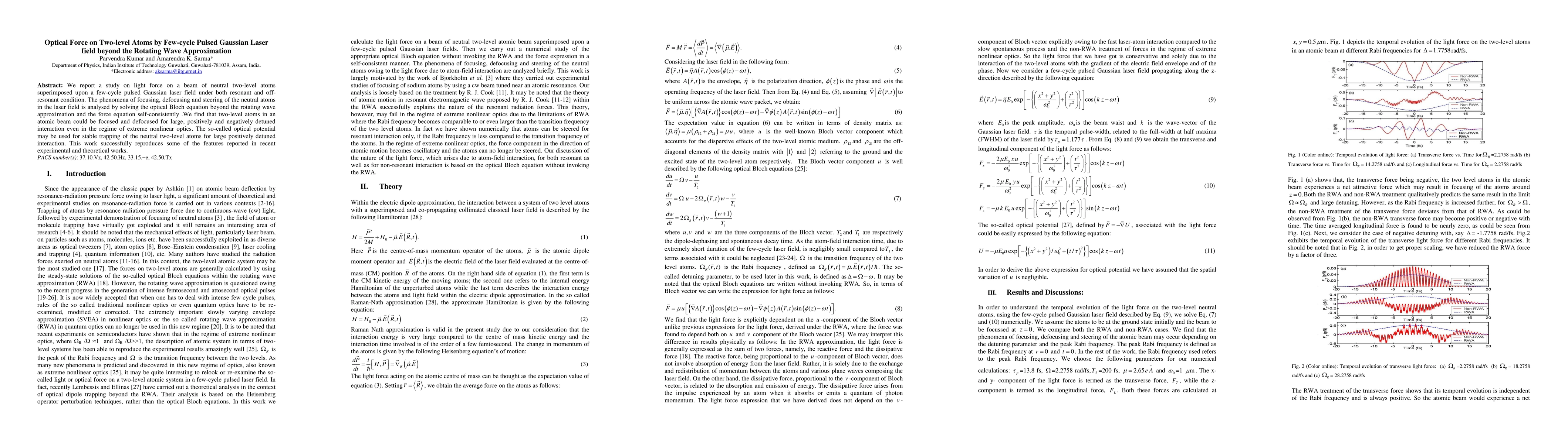 We report a study on light force on a beam of neutral two-level atoms superimposed upon a few-cycle pulsed Gaussian laser field under both resonant and off-resonant condition. The phenomena of focusing, defocusing and steering of the neutral atoms in the laser field is analysed by solving the optical Bloch equation beyond the rotating wave approximation and the force equation self-consistently .We find that two-level atoms in an atomic beam could be focused and defocused for large, positively and negatively detuned interaction even in the regime of extreme nonlinear optics. The so-called optical potential may be used for stable trapping of the neutral two-level atoms for large positively detuned interaction. This work successfully reproduces some of the features reported in recent experimental and theoretical works.