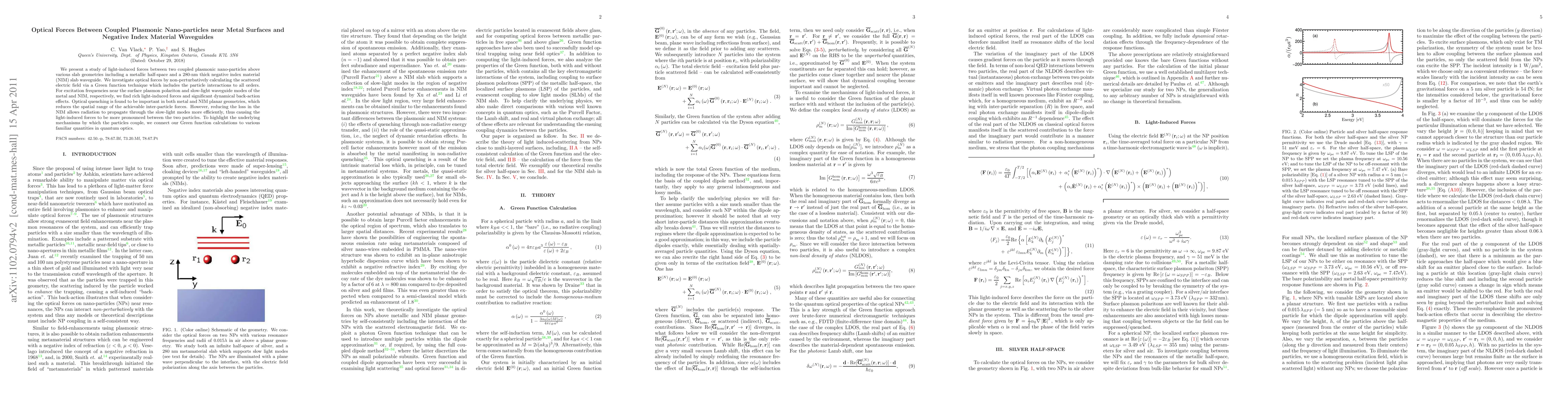 This paper investigates the optical forces between coupled plasmonic nanoparticles above different slab geometries, including metallic and negative index material (NIM) waveguides, using a Green function technique to calculate scattered electric fields. It finds significant light-induced forces and dynamical back-action effects, with optical quenching reducing the range of inter-particle forces, though reduced loss in NIM enhances force magnitude.