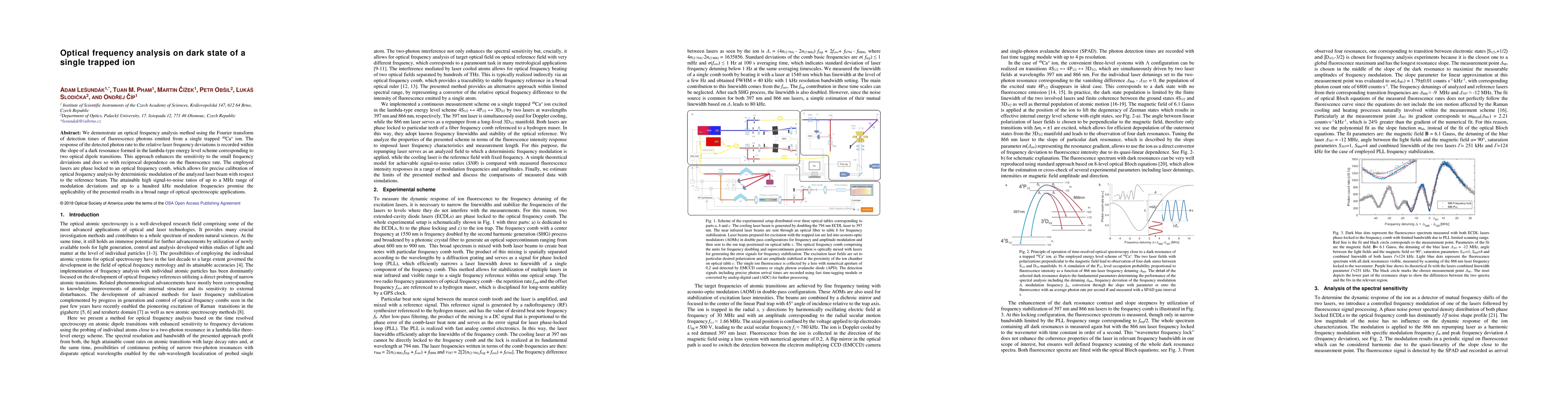 We demonstrate an optical frequency analysis method using the Fourier transform of detection times of fluorescence photons emitted from a single trapped 40Ca+ ion. The response of the detected photon rate to the relative laser frequency deviations is recorded within the slope of a dark resonance formed in the lambda-type energy level scheme corresponding to two optical dipole transitions. This approach enhances the sensitivity to the small frequency deviations and does so with reciprocal dependence on the fluorescence rate. The employed lasers are phase locked to an optical frequency comb, which allows for precise calibration of optical frequency analysis by deterministic modulation of the analyzed laser beam with respect to the reference beam. The attainable high signal-to-noise ratios of up to a MHz range of modulation deviations and up to a hundred kHz modulation frequencies promise the applicability of the presented results in a broad range of optical spectroscopic applications.