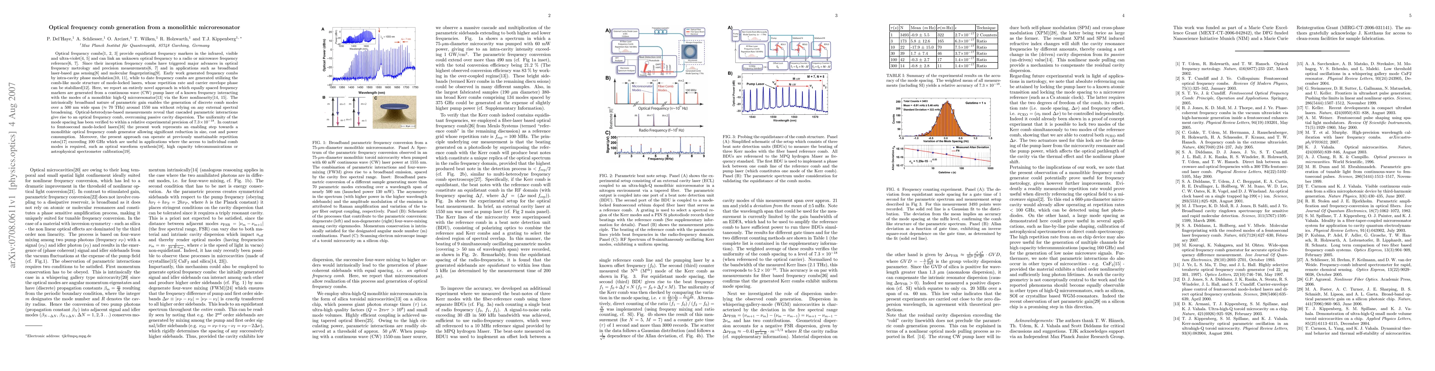 This paper reports a novel method for generating optical frequency combs using a continuous wave laser interacting with the modes of a monolithic microresonator, achieving uniform frequency markers over a 500 nm span via Kerr nonlinearity without external spectral broadening, verified with high precision.