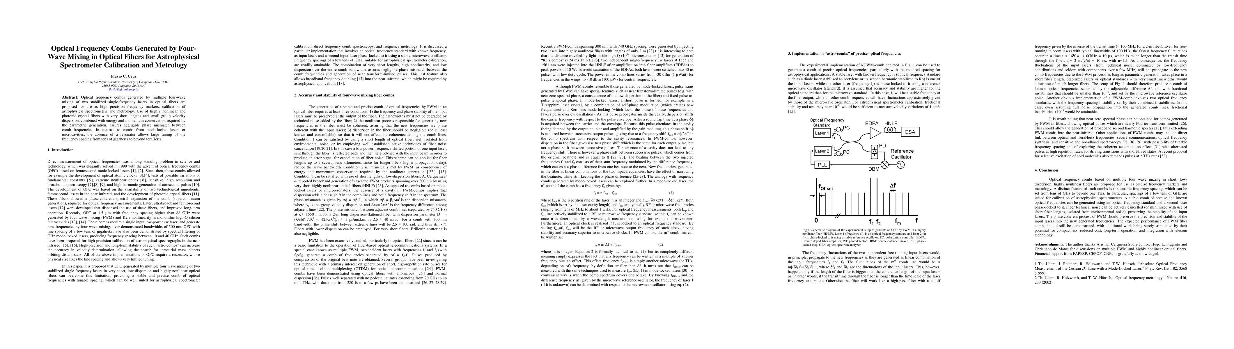 This paper proposes the use of optical frequency combs generated via four-wave mixing in optical fibers as high-precision frequency markers for astrophysical spectrometer calibration and metrology. These combs, generated by stabilized single-frequency lasers, offer large tuning ranges and negligible phase mismatch, contrasting with combs from mode-locked lasers or microcavities.