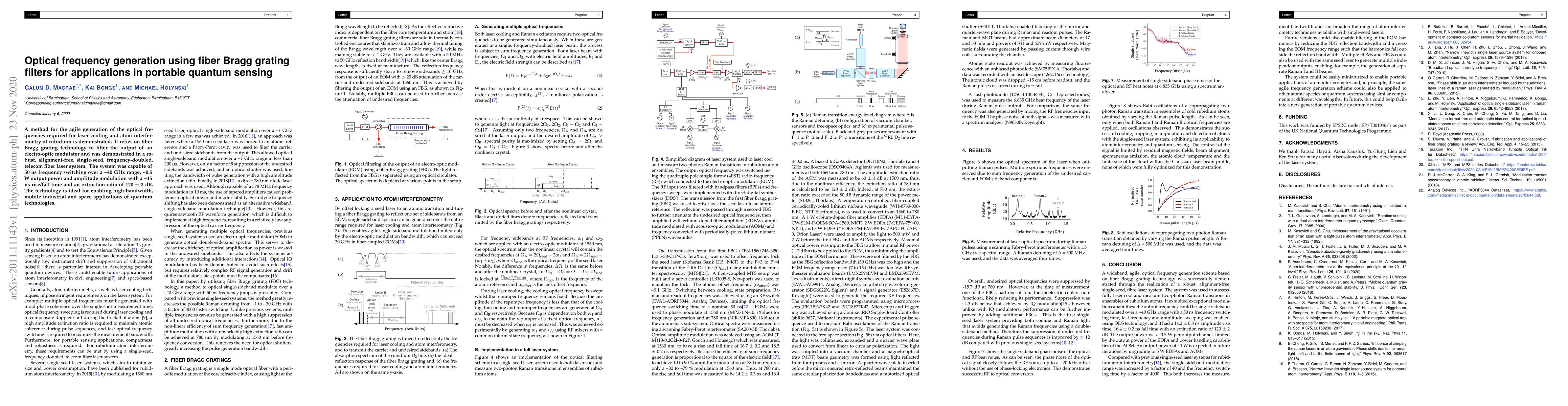 This paper presents an agile optical frequency generation method using fiber Bragg grating filters for laser cooling and atom interferometry in rubidium. The system demonstrates robust, alignment-free frequency switching over a 40 GHz range with high output power and modulation capabilities, suitable for portable quantum sensing applications.