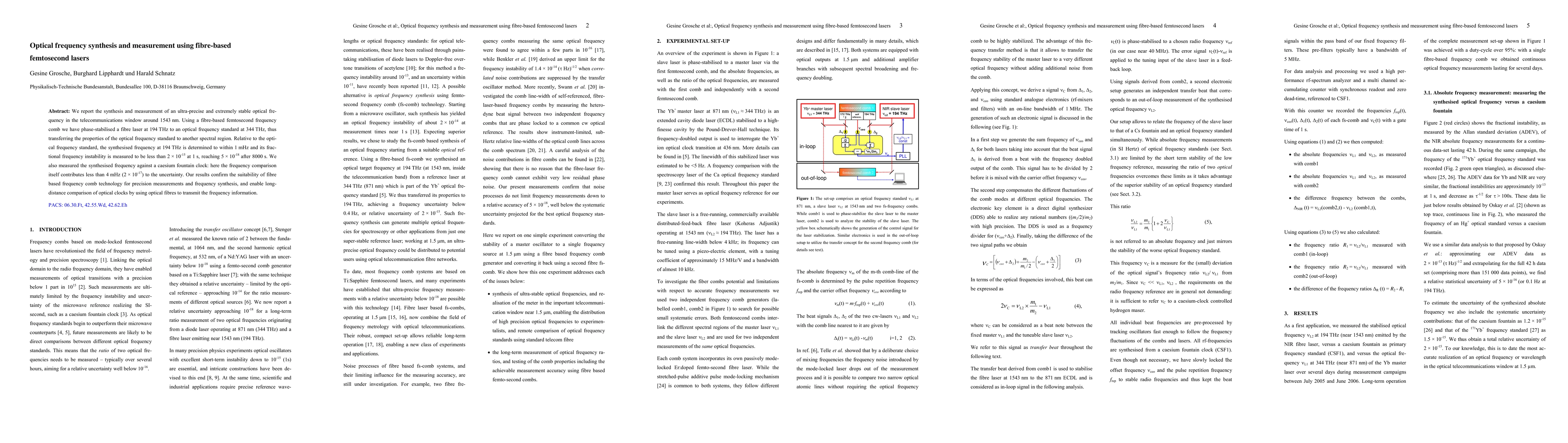 This paper reports the precise synthesis and measurement of optical frequencies using fibre-based femtosecond lasers, achieving an ultra-stable frequency at 194 THz with an instability of less than 2*10^{-15} at 1 second. The method demonstrates the potential for long-distance optical clock comparisons via fibre transmission.