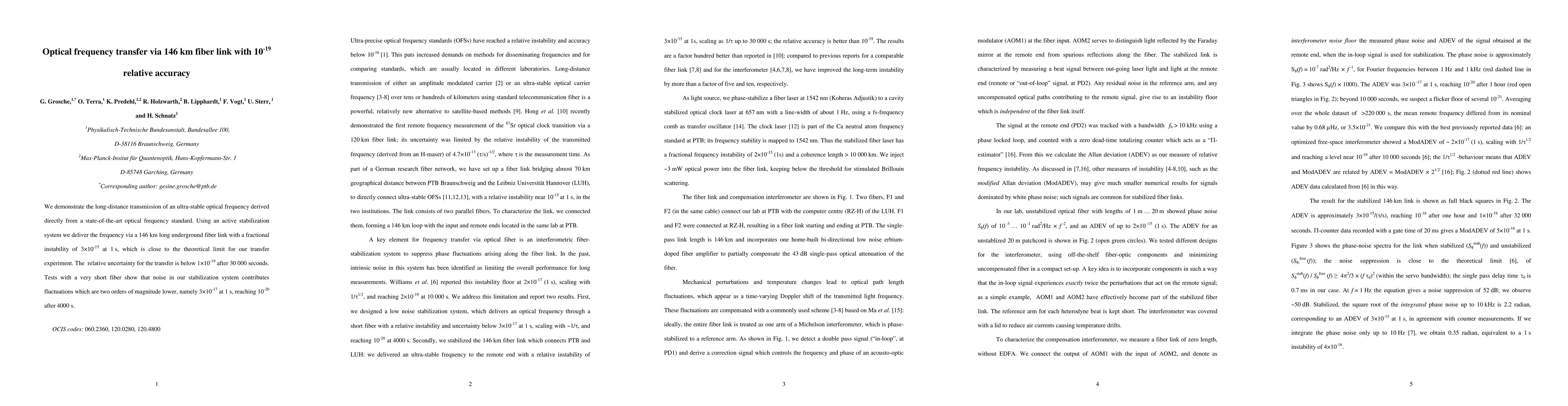 This paper demonstrates the successful transmission of an ultra-stable optical frequency over a 146 km fiber link with an impressive relative uncertainty of 10^-19 after 30,000 seconds. The active stabilization system achieves a fractional instability of 3*10^-15 at 1 second, nearing theoretical limits.