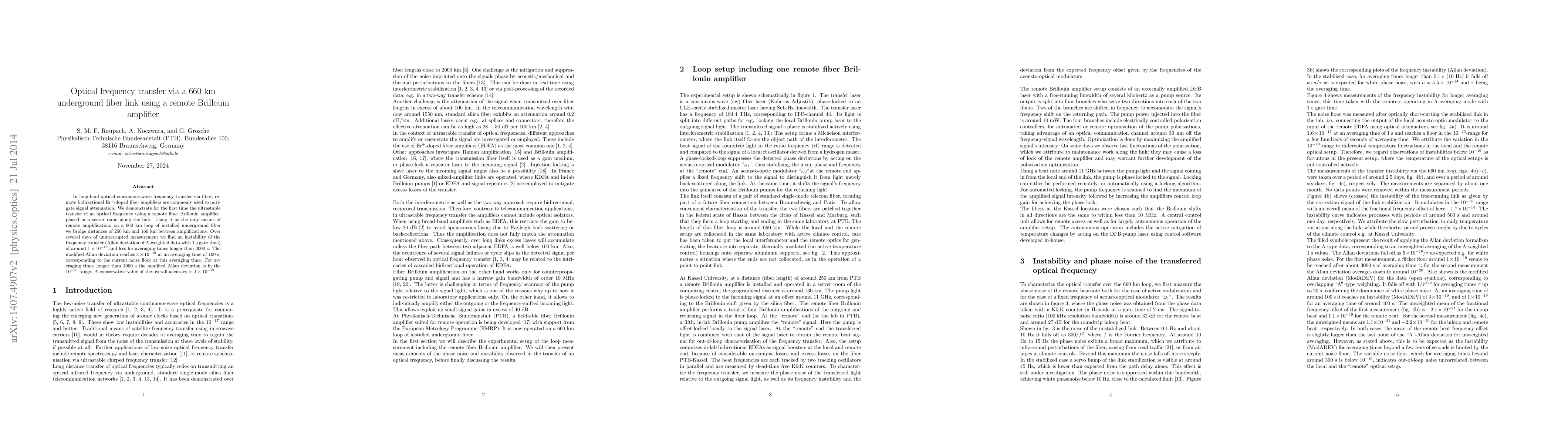 In long-haul optical continuous-wave frequency transfer via fiber, remote bidirectional Er$^+$-doped fiber amplifiers are commonly used to mitigate signal attenuation. We demonstrate for the first time the ultrastable transfer of an optical frequency using a remote fiber Brillouin amplifier, placed in a server room along the link. Using it as the only means of remote amplification, on a 660 km loop of installed underground fiber we bridge distances of 250 km and 160 km between amplifications. Over several days of uninterrupted measurement we find an instability of the frequency transfer (Allan deviation of $\Lambda$-weighted data with 1 s gate time) of around $1\times10^{-19}$ and less for averaging times longer than 3000 s. The modified Allan deviation reaches $3\times10^{-19}$ at an averaging time of 100 s, corresponding to the current noise floor at this averaging time. For averaging times longer than 1000 s the modified Allan deviation is in the $10^{-20}$ range. A conservative value of the overall accuracy is $1\times10^{-19}$.