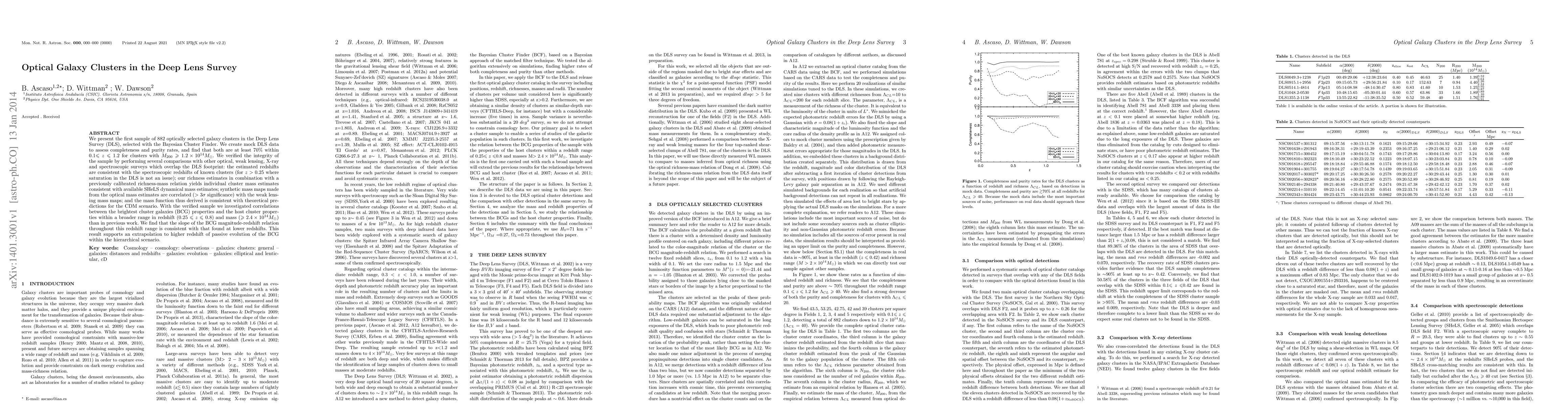 We present the first sample of 882 optically selected galaxy clusters in the Deep Lens Survey (DLS), selected with the Bayesian Cluster Finder. We create mock DLS data to assess completeness and purity rates, and find that both are at least $70\%$ within 0.1$\le z \le$ 1.2 for clusters with $M_{200}\ge 1.2\times 10^{14}M_{\odot}$. We verified the integrity of the sample by performing several comparisons with other optical, weak lensing, X-ray and spectroscopic surveys which overlap the DLS footprint: the estimated redshifts are consistent with the spectroscopic redshifts of known clusters (for $z>0.25$ where saturation in the DLS is not an issue); our richness estimates in combination with a previously calibrated richness-mass relation yields individual cluster mass estimates consistent with available SHeLS dynamical mass estimates; synthetic mass maps made from the optical mass estimates are correlated ($>3\sigma$ significance) with the weak lensing mass maps; and the mass function thus derived is consistent with theoretical predictions for the CDM scenario. With the verified sample we investigated correlations between the brightest cluster galaxies (BCG) properties and the host cluster properties within a broader range in redshift (0.25 $\le z \le$ 0.8) and mass ($\ge2.4\times 10^{14}M_{\odot}$) than in previous work. We find that the slope of the BCG magnitude-redshift relation throughout this redshift range is consistent with that found at lower redshifts. This result supports an extrapolation to higher redshift of passive evolution of the BCG within the hierarchical scenario.