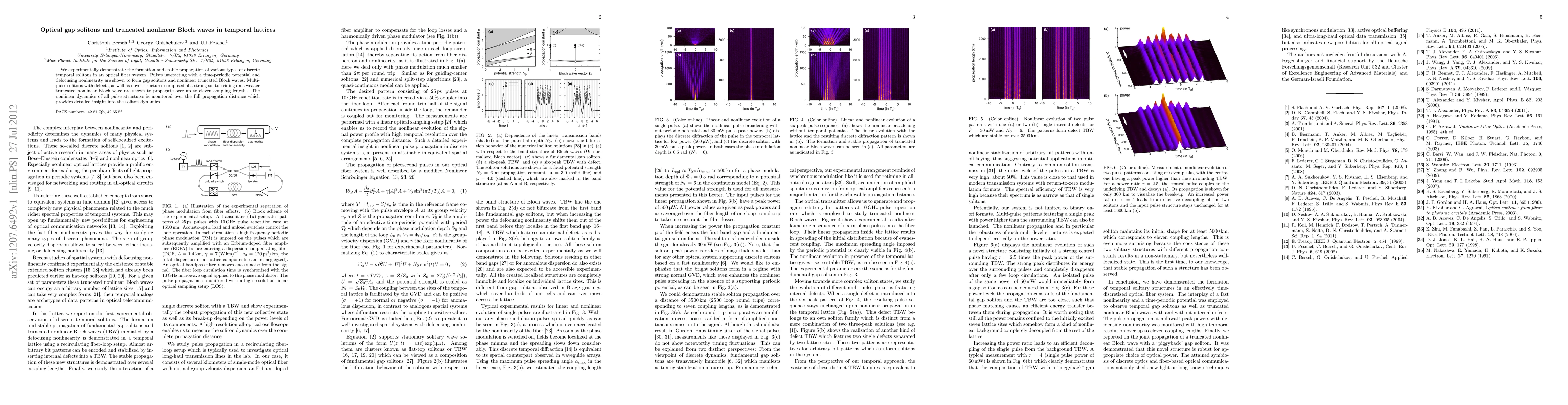 We experimentally demonstrate the formation and stable propagation of various types of discrete temporal solitons in an optical fiber system. Pulses interacting with a time-periodic potential and defocusing nonlinearity are shown to form gap solitons and nonlinear truncated Bloch waves. Multi-pulse solitons with defects, as well as novel structures composed of a strong soliton riding on a weaker truncated nonlinear Bloch wave are shown to propagate over up to eleven coupling lengths. The nonlinear dynamics of all pulse structures is monitored over the full propagation distance which provides detailed insight into the soliton dynamics.