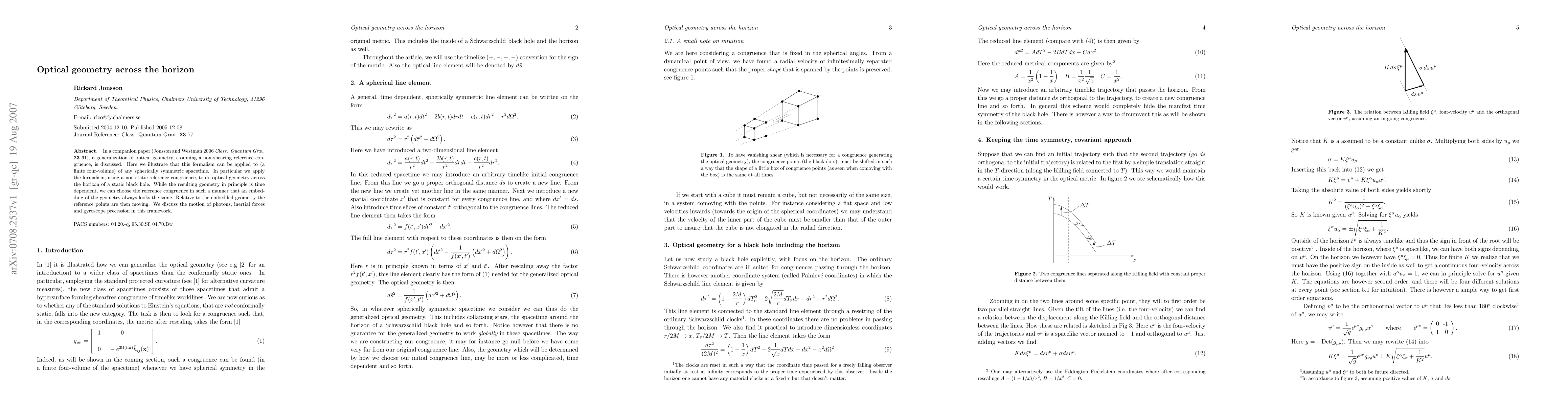 In a companion paper (Jonsson and Westman, Class. Quantum Grav. 23 (2006) 61), a generalization of optical geometry, assuming a non-shearing reference congruence, is discussed. Here we illustrate that this formalism can be applied to a finite four-volume of any spherically symmetric spacetime. In particular we apply the formalism, using a non-static reference congruence, to do optical geometry across the horizon of a static black hole. While the resulting geometry in principle is time dependent, we can choose the reference congruence in such a manner that an embedding of the geometry always looks the same. Relative to the embedded geometry the reference points are then moving. We discuss the motion of photons, inertial forces and gyroscope precession in this framework.