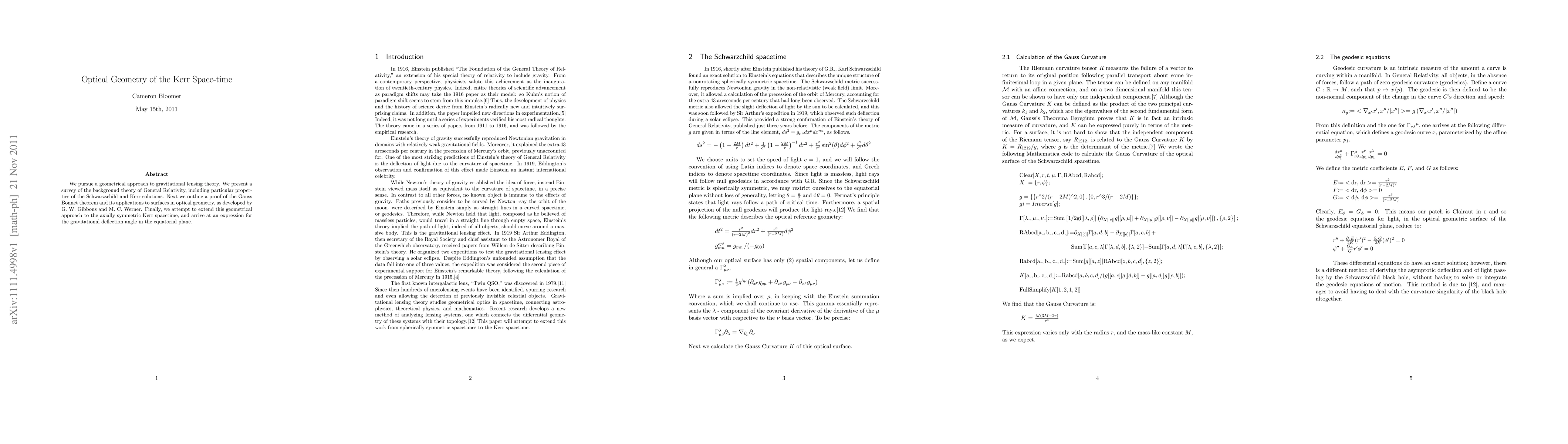 We pursue a geometrical approach to gravitational lensing theory. We present a survey of the background theory of General Relativity, including particular properties of the Schwarzschild and Kerr solutions. Next we outline a proof of the Gauss Bonnet theorem and its applications to surfaces in optical geometry, as developed by G. W. Gibbons and M. C. Werner. Finally, we attempt to extend this geometrical approach to the axially symmetric Kerr spacetime, and arrive at an expression for the gravitational deflection angle in the equatorial plane.