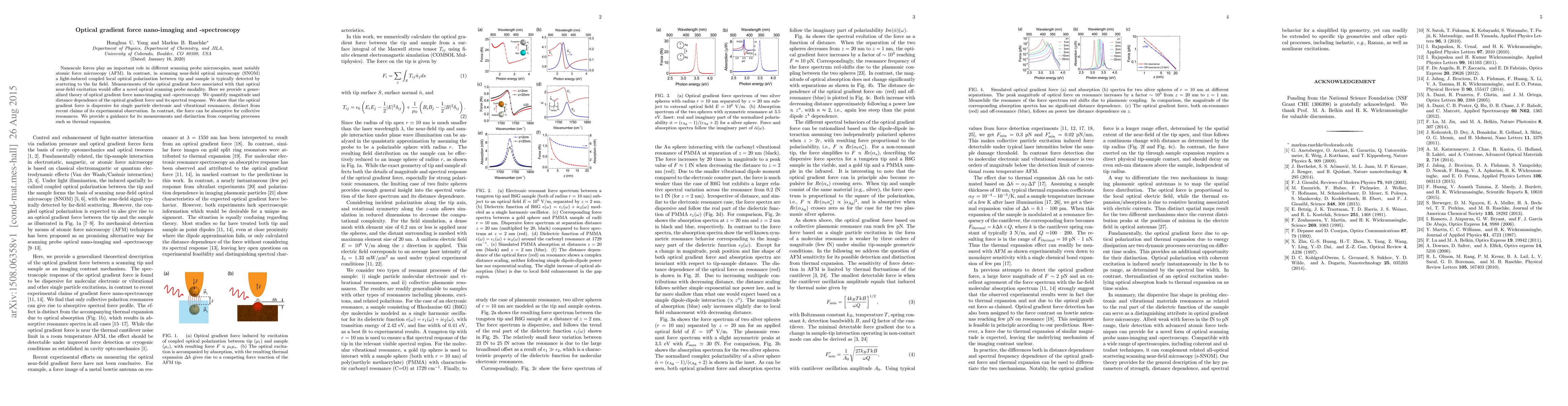 This paper develops a theoretical framework for optical gradient force nano-imaging and spectroscopy, quantifying its magnitude and distance dependence, and demonstrating its dispersive nature for single particle resonances. The study also distinguishes it from absorptive forces in collective resonances and provides guidelines for its measurement.