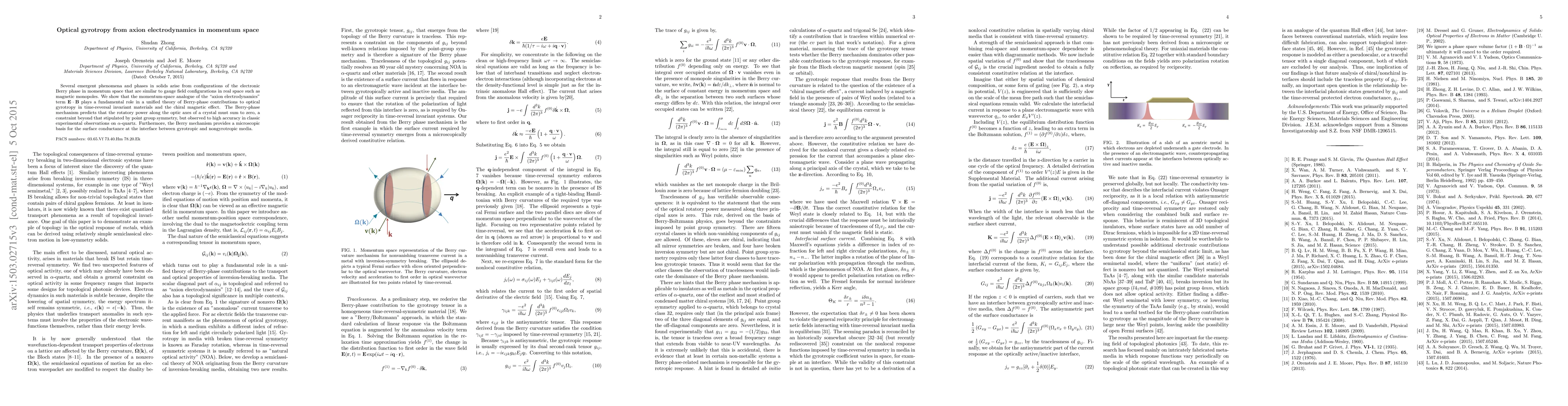 Several emergent phenomena and phases in solids arise from configurations of the electronic Berry phase in momentum space that are similar to gauge field configurations in real space such as magnetic monopoles. We show that the momentum-space analogue of the "axion electrodynamics" term $\mathbf{E}\cdot\mathbf{B}$ plays a fundamental role in a unified theory of Berry-phase contributions to optical gyrotropy in time-reversal invariant materials and the chiral magnetic effect. The Berry-phase mechanism predicts that the rotatory power along the optic axes of a crystal must sum to zero, a constraint beyond that stipulated by point group symmetry, but observed to high accuracy in classic experimental observations on $\alpha$-quartz. Furthermore, the Berry mechanism provides a microscopic basis for the surface conductance at the interface between gyrotropic and nongyrotropic media.