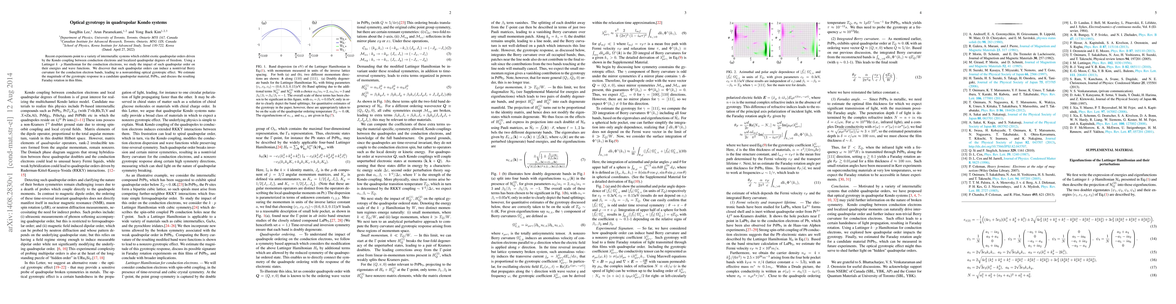 Recent experiments point to a variety of intermetallic systems which exhibit exotic quadrupolar orders driven by the Kondo coupling between conduction electrons and localized quadrupolar degrees of freedom. Using a Luttinger k.p Hamiltonian for the conduction electrons, we study the impact of such quadrupolar order on their energies and wave functions. We discover that such quadrupolar orders can induce a nontrivial Berry curvature for the conduction electron bands, leading to a nonvanishing optical gyrotropic effect. We estimate the magnitude of the gyrotropic response in a candidate quadrupolar material, PrPb3, and discuss the resulting Faraday rotation in thin films.